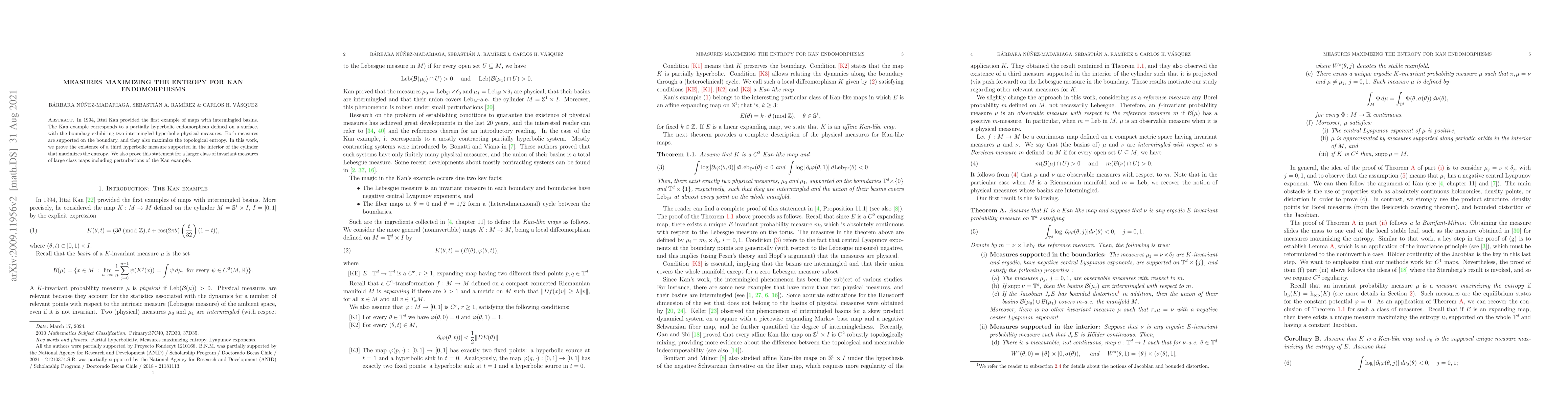 This research proves the existence of a third hyperbolic measure maximizing entropy in the interior of a cylinder for a broader class of maps, including Kan's example. It also extends this result to perturbations of Kan's example and a larger class of invariant measures for extensive maps.