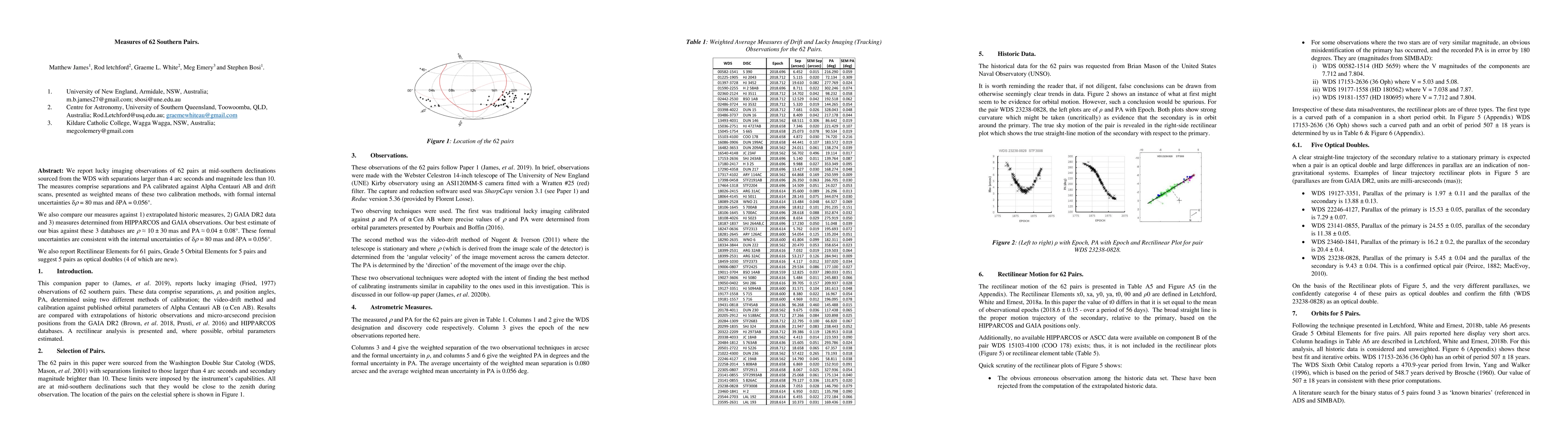 We report lucky imaging observations of 62 pairs at mid-southern declinations sourced from the WDS with separations larger than 4 arc seconds and magnitude less than 10. The measures comprise separations and PA calibrated against Alpha Centauri AB and drift scans, presented as weighted means of these two calibration methods, with formal internal uncertainties \delta\rho = 80 mas and \delta PA = 0.056(deg). We also compare our measures against 1) extrapolated historic measures, 2) GAIA DR2 data and 3) measures determined from HIPPARCOS and GAIA observations. Our best estimate of our bias against these 3 databases are \rho \approx 10 \pm 30 mas and PA \approx 0.04 \pm 0.08(deg). These formal uncertainties are consistent with the internal uncertainties of \delta\rho = 80 mas and \delta PA = 0.056(deg). We also report Rectilinear Elements for 61 pairs, Grade 5 Orbital Elements for 5 pairs and suggest 5 pairs as optical doubles (4 of which are new).
