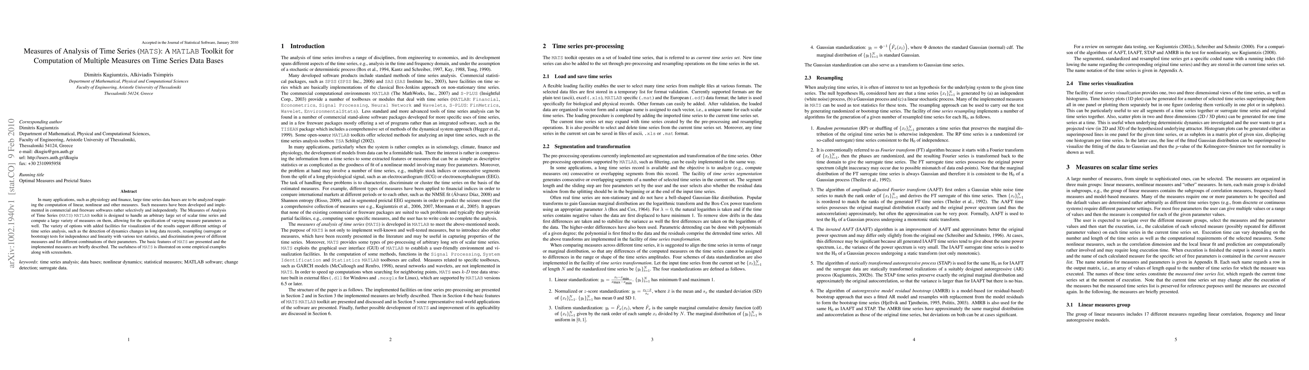 In many applications, such as physiology and finance, large time series data bases are to be analyzed requiring the computation of linear, nonlinear and other measures. Such measures have been developed and implemented in commercial and freeware softwares rather selectively and independently. The Measures of Analysis of Time Series ({\tt MATS}) {\tt MATLAB} toolkit is designed to handle an arbitrary large set of scalar time series and compute a large variety of measures on them, allowing for the specification of varying measure parameters as well. The variety of options with added facilities for visualization of the results support different settings of time series analysis, such as the detection of dynamics changes in long data records, resampling (surrogate or bootstrap) tests for independence and linearity with various test statistics, and discrimination power of different measures and for different combinations of their parameters. The basic features of {\tt MATS} are presented and the implemented measures are briefly described. The usefulness of {\tt MATS} is illustrated on some empirical examples along with screenshots.