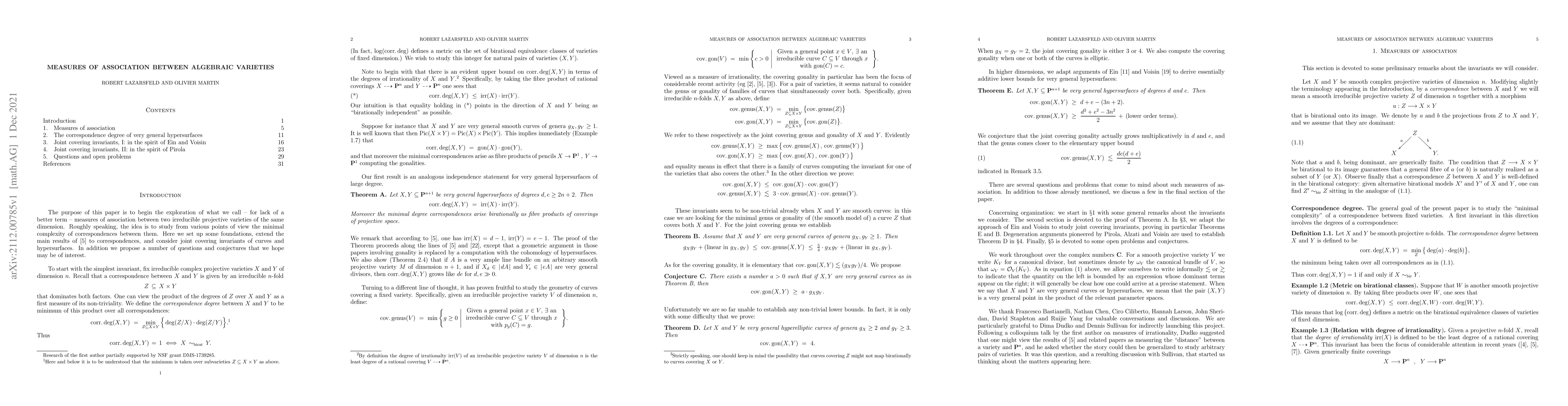 Researchers explore measures of association between algebraic varieties, studying minimal complexity of correspondences and proposing conjectures for joint covering invariants.