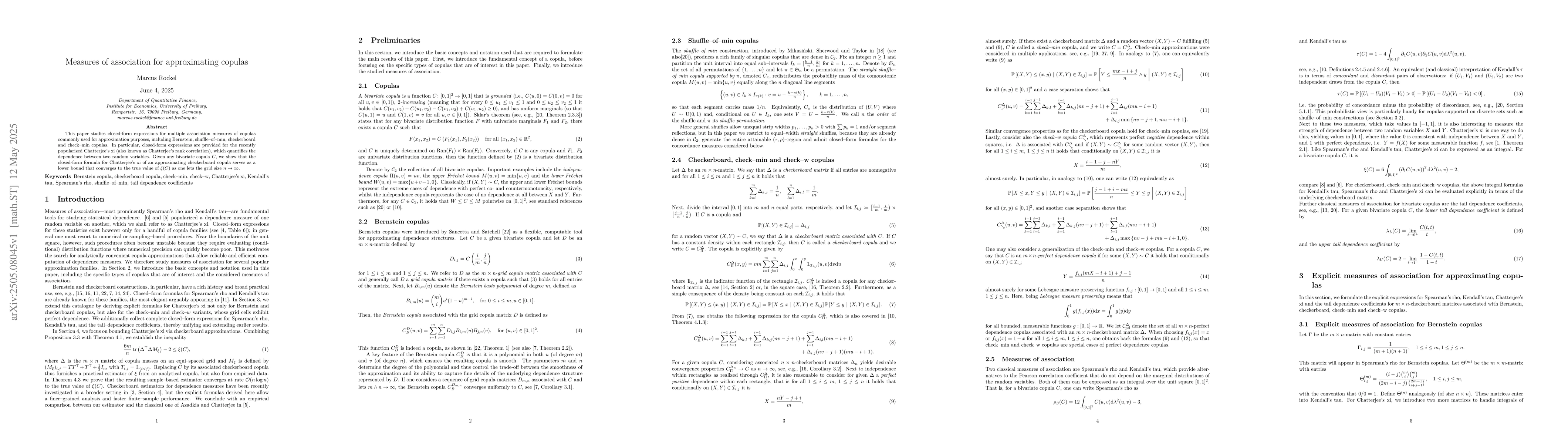 The paper derives closed-form expressions for various association measures used in copula approximation, focusing on Bernstein, shuffle-of-min, checkerboard, and check-min copulas, with a particular emphasis on Chatterjee's xi (also known as Chatterjee's rank correlation).