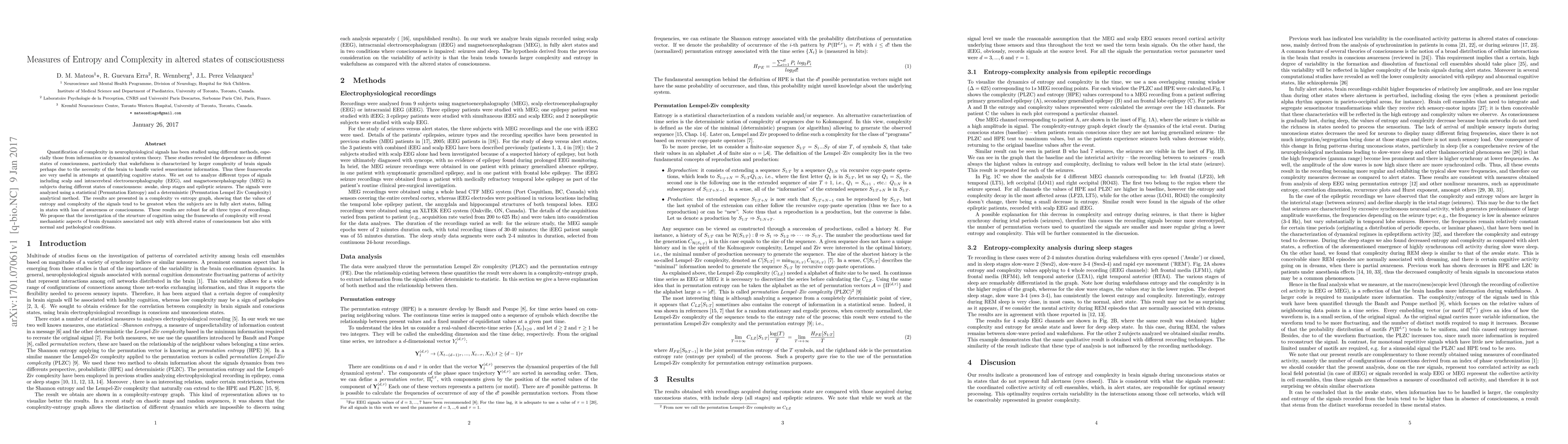 Quantification of complexity in neurophysiological signals has been studied using different methods, especially those from information or dynamical system theory. These studies revealed the dependence on different states of consciousness, particularly that wakefulness is characterized by larger complexity of brain signals perhaps due to the necessity of the brain to handle varied sensorimotor information. Thus these frameworks are very useful in attempts at quantifying cognitive states. We set out to analyze different types of signals including scalp and intracerebral electroencephalography (EEG), and magnetoencephalography (MEG) in subjects during different states of consciousness: awake, sleep stages and epileptic seizures. The signals were analyzed using a statistical (Permutation Entropy) and a deterministic (Permutation Lempel Ziv Complexity) analytical method. The results are presented in a complexity vs entropy graph, showing that the values of entropy and complexity of the signals tend to be greatest when the subjects are in fully alert states, falling in states with loss of awareness or consciousness. These results are robust for all three types of recordings. We propose that the investigation of the structure of cognition using the frameworks of complexity will reveal mechanistic aspects of brain dynamics associated not only with altered states of consciousness but also with normal and pathological conditions.