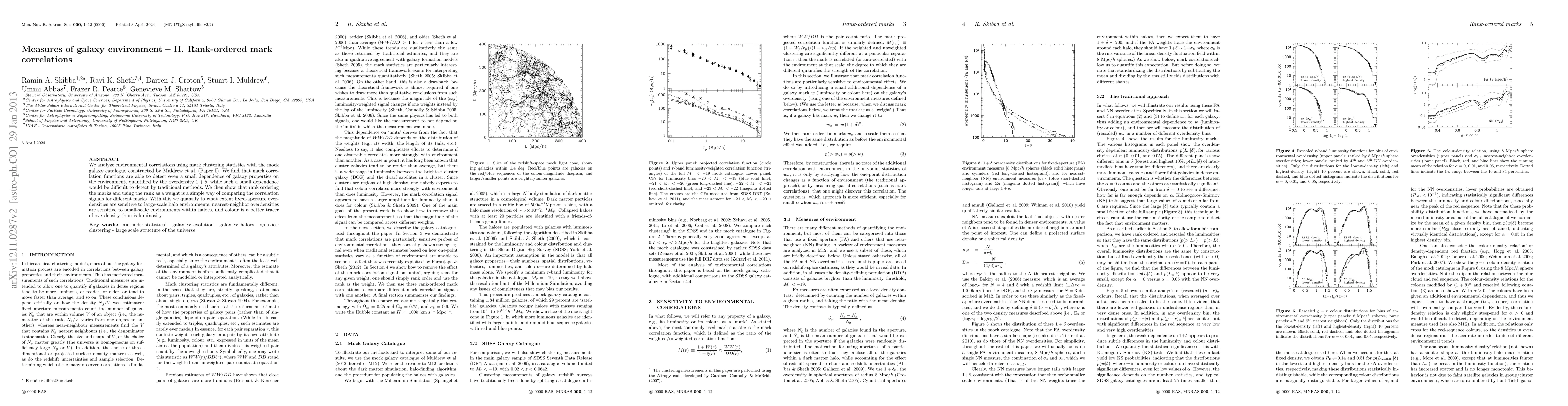 We analyze environmental correlations using mark clustering statistics with the mock galaxy catalogue constructed by Muldrew et al. (Paper I). We find that mark correlation functions are able to detect even a small dependence of galaxy properties on the environment, quantified by the overdensity $1+\delta$, while such a small dependence would be difficult to detect by traditional methods. We then show that rank ordering the marks and using the rank as a weight is a simple way of comparing the correlation signals for different marks. With this we quantify to what extent fixed-aperture overdensities are sensitive to large-scale halo environments, nearest-neighbor overdensities are sensitive to small-scale environments within haloes, and colour is a better tracer of overdensity than is luminosity.