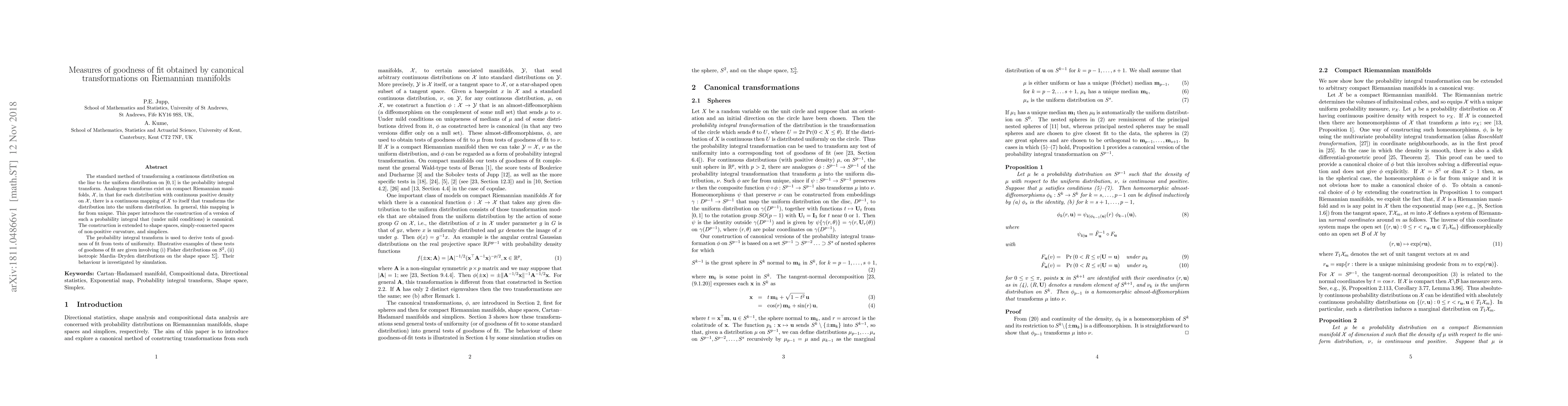 This paper introduces a canonical transformation method on Riemannian manifolds to convert distributions into uniform distributions, extending the probability integral transform. It develops tests of goodness of fit derived from uniformity tests, illustrated through simulations on Fisher distributions and Mardia-Dryden distributions on shape spaces.