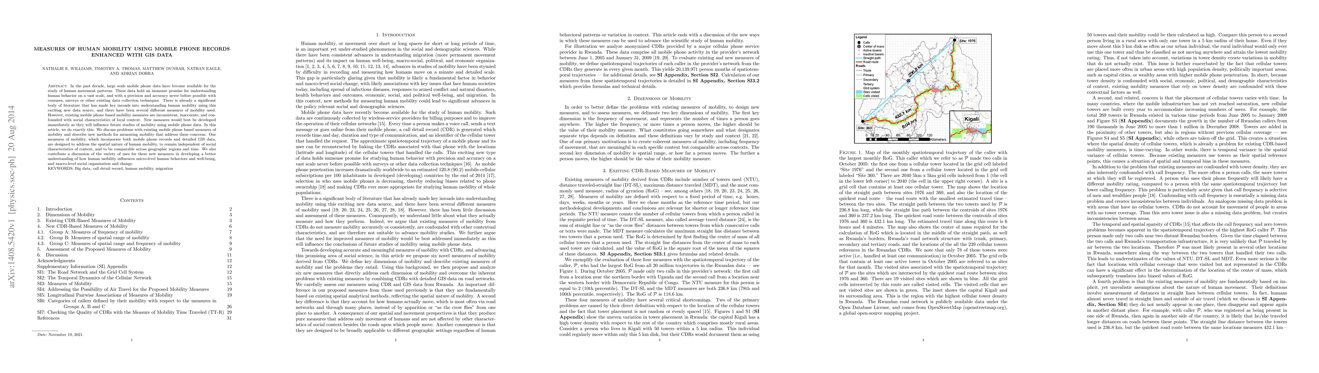 This paper introduces new measures of human mobility using mobile phone records enhanced with GIS data, aiming to address the inconsistencies and inaccuracies of existing methods. The proposed measures are designed to be context-independent and comparable across regions and time, facilitating better understanding of both micro-level human behaviors and macro-level social organization.
