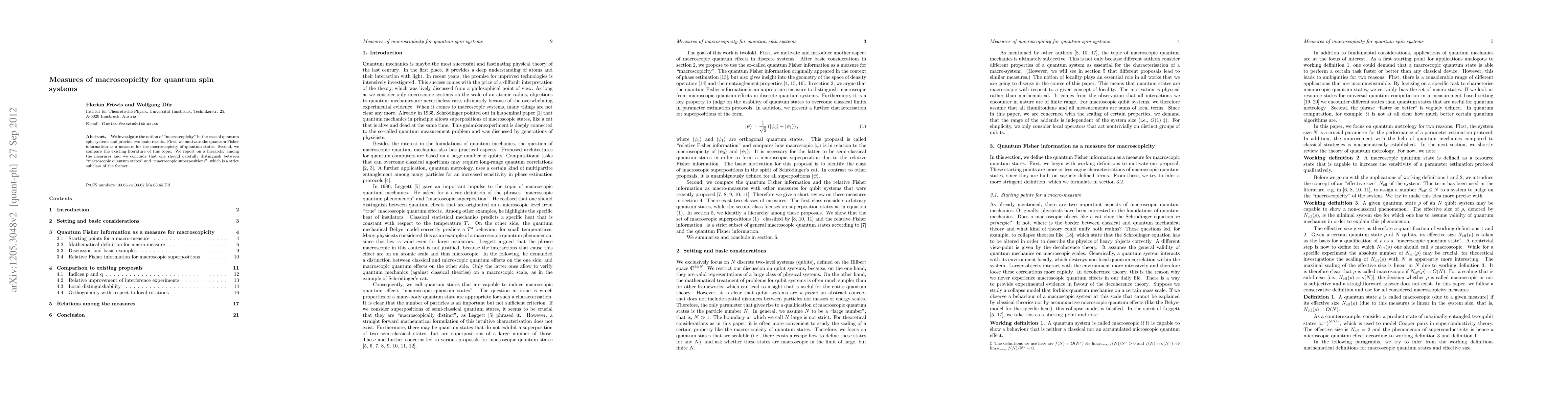 This paper explores the concept of "macroscopicity" in large quantum spin systems, proposing the Fisher information as a measure for this property. It also compares existing measures, highlighting a hierarchy and distinguishing between "macroscopic quantum states" and "macroscopic superpositions."