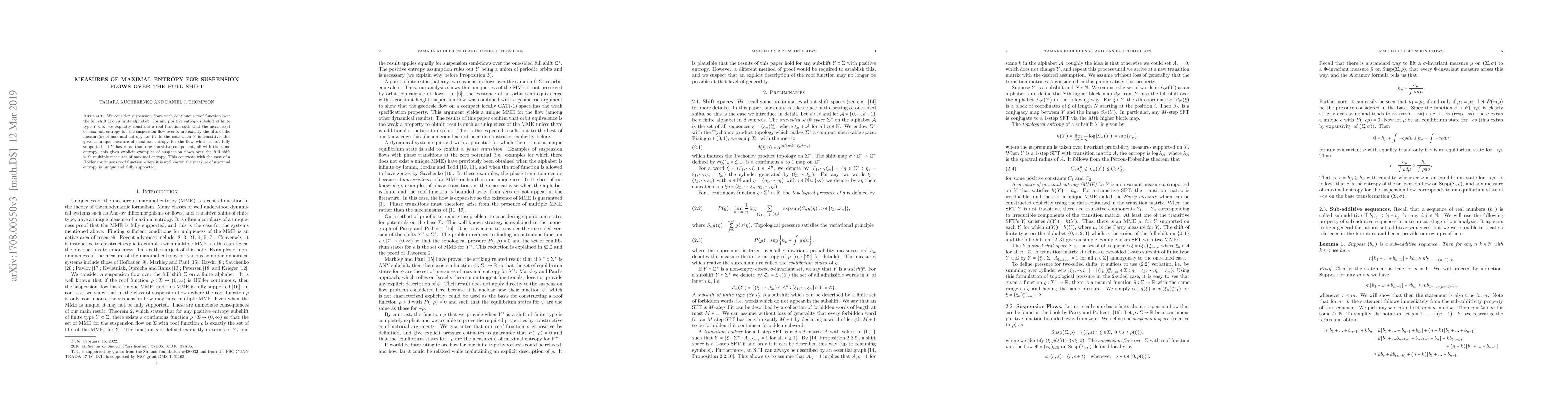 This paper constructs roof functions for suspension flows over the full shift to explicitly identify measures of maximal entropy, showing that these measures correspond to those of subshifts of finite type. It reveals that multiple measures of maximal entropy can exist when the subshift has multiple transitive components, contrasting with the unique, fully supported measure under H\"older continuous roof functions.