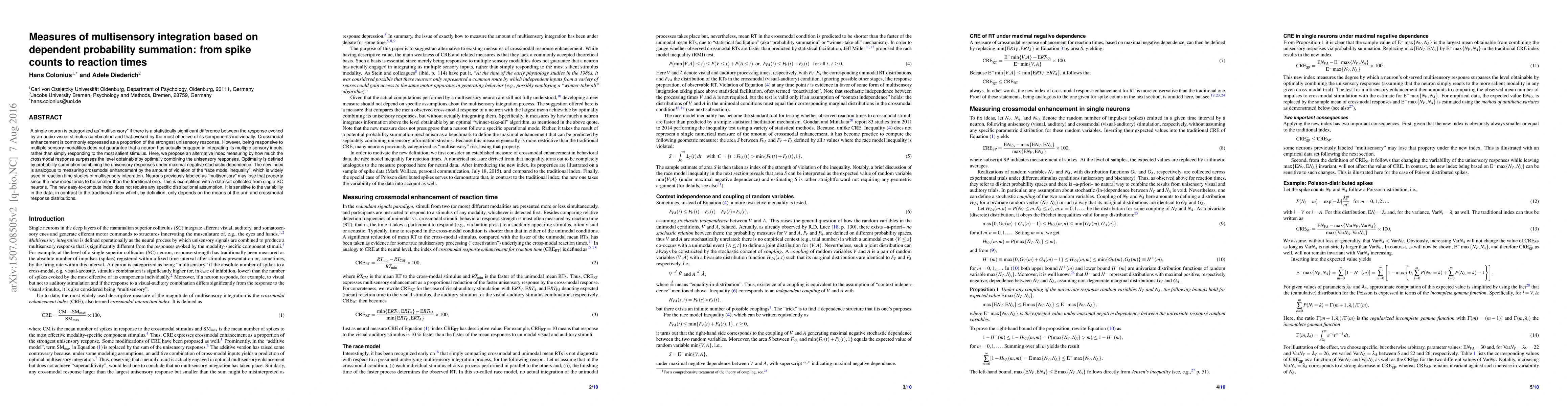 This paper proposes a new index for measuring multisensory integration based on dependent probability summation, which more accurately captures how much the crossmodal response surpasses optimal unisensory combination, compared to traditional measures. The new index is distribution-free and sensitive to variability in the data, potentially redefining some neurons previously labeled as "multisensory."