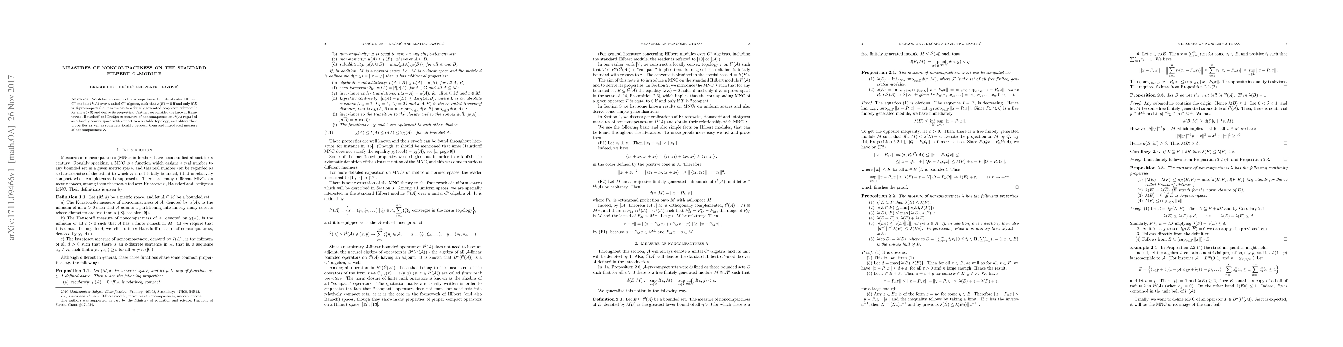 This paper introduces a measure of noncompactness on the standard Hilbert C*-module l^2(α), which is equivalent to being ι-compact for any ι > 0. The properties of this measure are derived and compared with existing measures of noncompactness, including Kuratowski, Hausdorff, and Istrâteascu measures.