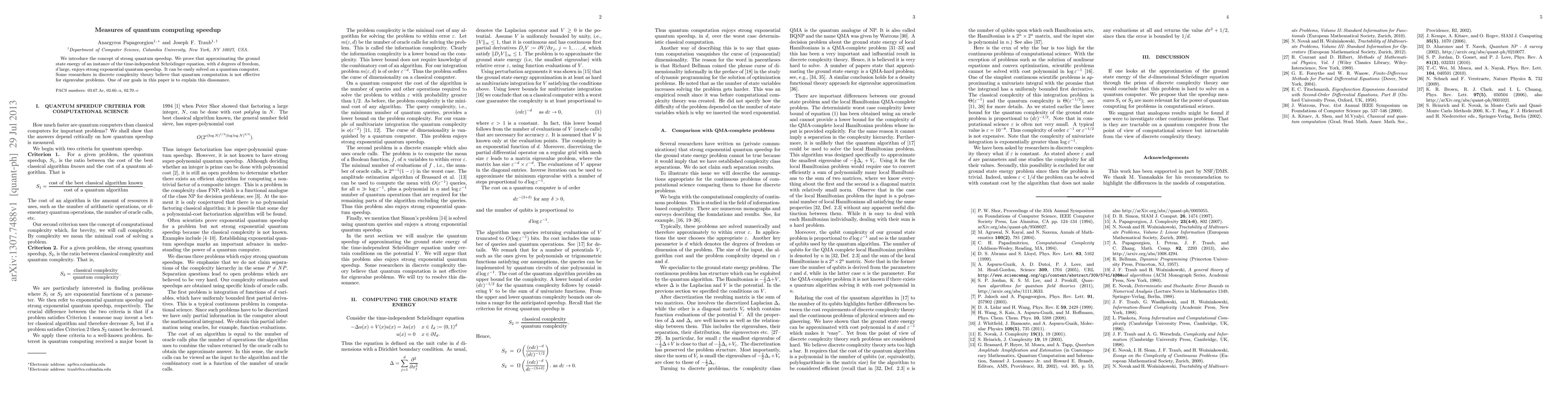 We introduce the concept of strong quantum speedup. We prove that approximating the ground state energy of an instance of the time-independent Schr\"odinger equation, with $d$ degrees of freedom, $d$ large, enjoys strong exponential quantum speedup. It can be easily solved on a quantum computer. Some researchers in discrete complexity theory believe that quantum computation is not effective for eigenvalue problems. One of our goals in this paper is to explain this dissonance.