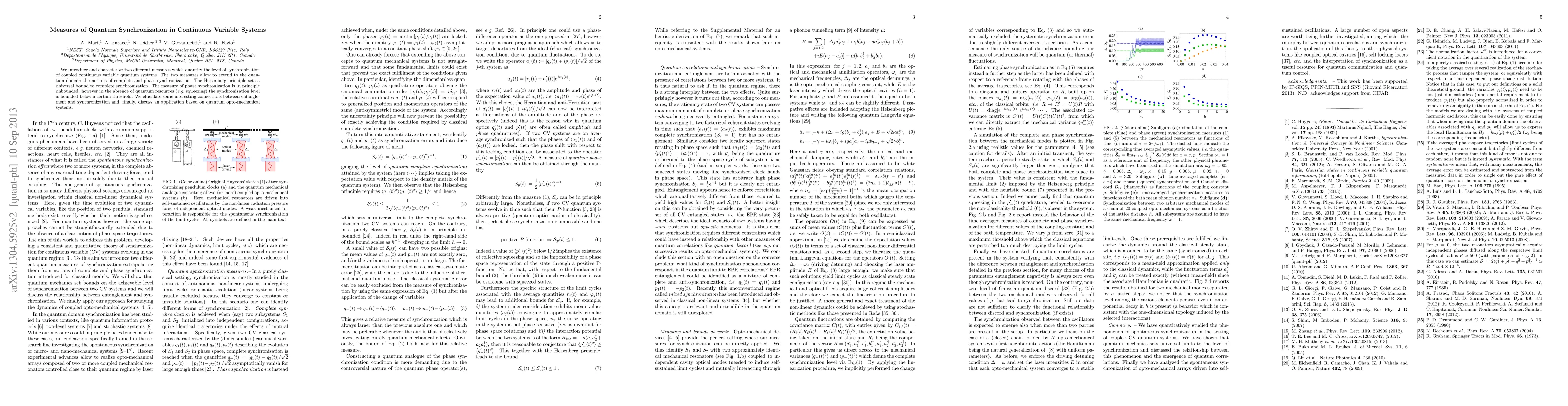 This paper introduces two measures for quantifying synchronization in continuous variable quantum systems, extending classical synchronization concepts to the quantum realm. It discusses bounds on complete synchronization due to the Heisenberg principle and highlights the unbounded nature of phase synchronization, with practical limits in resource-deprived scenarios.