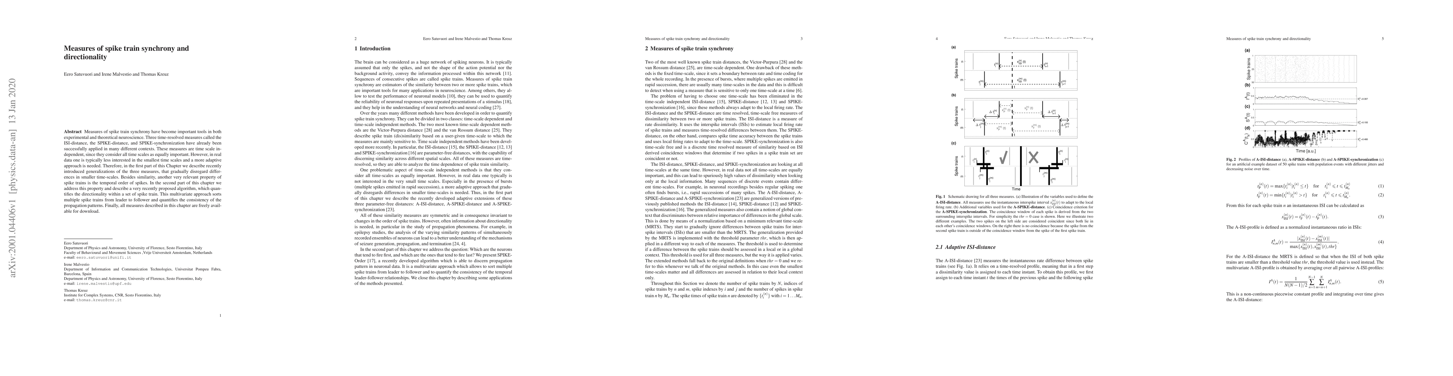 Measures of spike train synchrony have become important tools in both experimental and theoretical neuroscience. Three time-resolved measures called the ISI-distance, the SPIKE-distance, and SPIKE-synchronization have already been successfully applied in many different contexts. These measures are time scale independent, since they consider all time scales as equally important. However, in real data one is typically less interested in the smallest time scales and a more adaptive approach is needed. Therefore, in the first part of this Chapter we describe recently introduced generalizations of the three measures, that gradually disregard differences in smaller time-scales. Besides similarity, another very relevant property of spike trains is the temporal order of spikes. In the second part of this chapter we address this property and describe a very recently proposed algorithm, which quantifies the directionality within a set of spike train. This multivariate approach sorts multiple spike trains from leader to follower and quantifies the consistency of the propagation patterns. Finally, all measures described in this chapter are freely available for download.