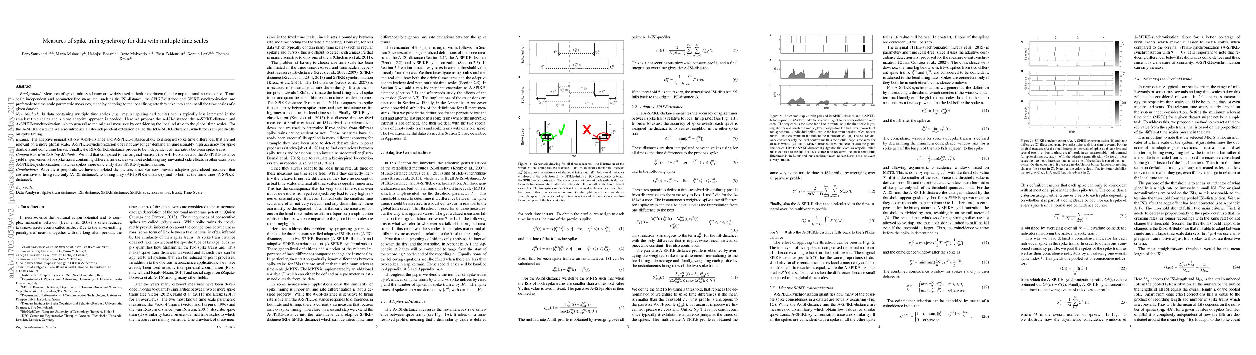 This paper proposes adaptive measures of spike train synchrony, including A-ISI-distance, A-SPIKE-distance, and A-SPIKE-synchronization, to better account for multiple time-scales in neural data. These measures improve upon existing methods by focusing on relevant time differences and rate-independent spike timing.