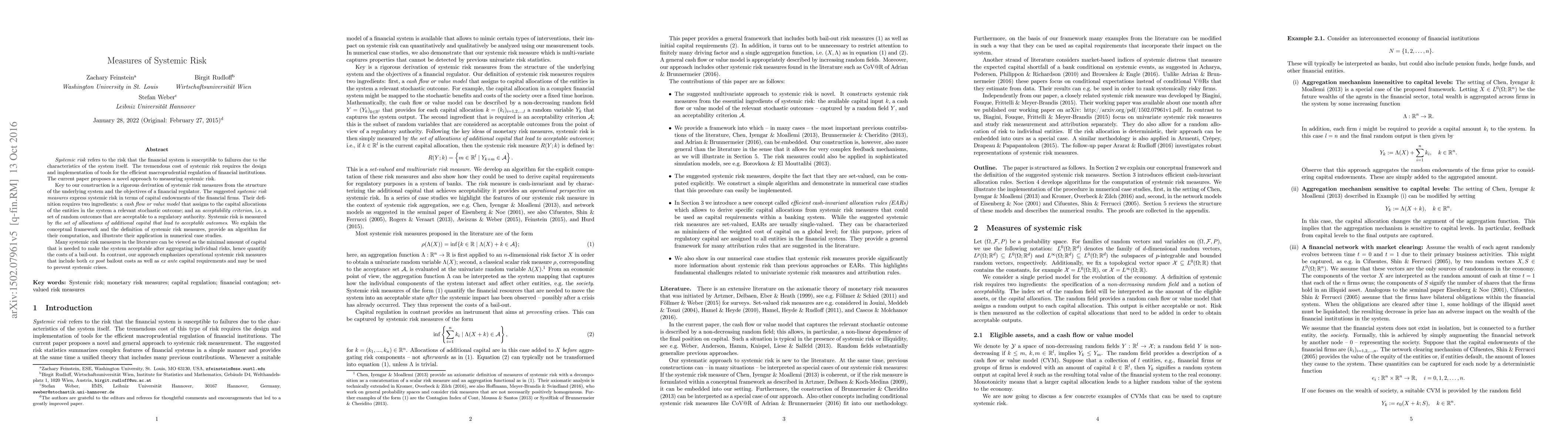 The paper proposes a novel approach to measuring systemic risk based on the financial system's structure and regulatory objectives, emphasizing operational measures that encompass both ex post bailout costs and ex ante capital requirements for prevention of systemic crises. The systemic risk measures are defined using a capital endowment model and an acceptability criterion, and are demonstrated through numerical case studies.