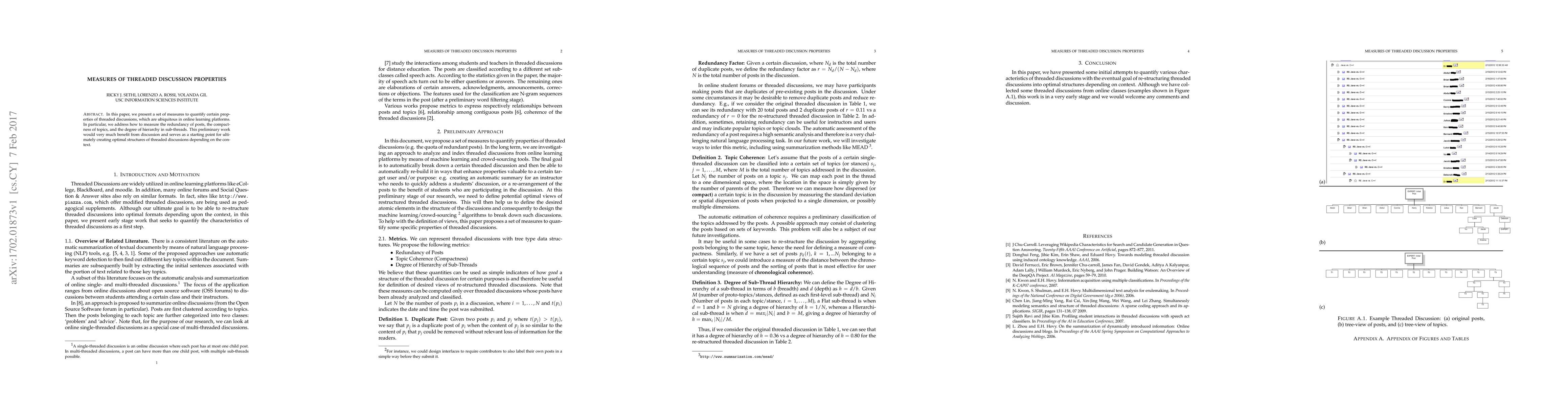In this paper, we present a set of measures to quantify certain properties of threaded discussions, which are ubiquitous in online learn-ing platforms. In particular, we address how to measure the redundancy of posts, the compactness of topics, and the degree of hierarchy in sub-threads. This preliminary work would very much benefit from discussion and serves as a starting point for ultimately creating optimal structures of threaded discussions depending on the context.