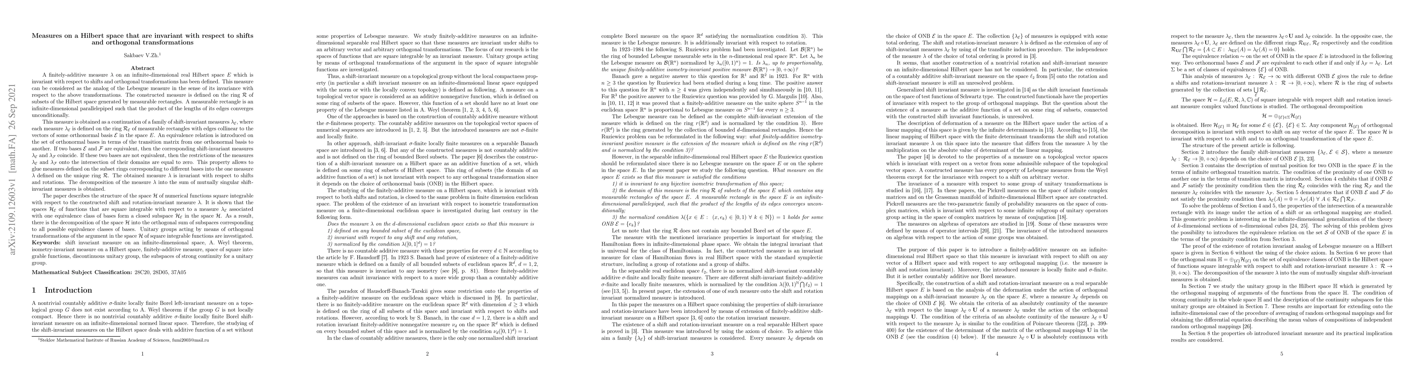 A finitely-additive measure $\lambda $ on an infinite-dimensional real Hilbert space $E$ which is invariant with respect to shifts and orthogonal mappings has been defined. This measure can be considered as the analog of the Lebesgue measure in the sense of its invariance with respect to the above transformations. The constructed measure is defined on the ring $\cal R$ of subsets of the Hilbert space generated by measurable rectangles. A measurable rectangle is an infinite-dimensional parallelepiped such that the product of the lengths of its edges converges unconditionally. The shift and rotation-invariant measure is obtained as a continuation of a family of shift-invariant measures $\lambda _{\cal E}$, where each measure $\lambda _{\cal E}$ is defined on the ring ${\cal R}_{\cal E}$ of measurable rectangles with edges collinear to the vectors of some orthonormal basis $\cal E$ in the space $E$. An equivalence relation is introduced on the set of orthonormal bases in terms of the transition matrix from one orthonormal basis to another. The equivalence relation allows to glue measures defined on the subset rings corresponding to different bases into the one measure $\lambda $ defined on the unique ring $\cal R$. The obtained measure $\lambda $ is invariant with respect to shifts and rotations. The decomposition of the measure $\lambda$ into the sum of mutually singular shift-invariant measures is obtained. The paper describes the structure of the space $\cal H$ of numerical functions square integrable with respect to the constructed shift and rotation-invariant measure $\lambda $. The decomposition of the space $\cal H$ into the orthogonal sum of subspaces corresponding to all possible equivalence classes of bases is obtained. Unitary groups acting by means of orthogonal transformations of the argument in the space $\cal H$ of square integrable functions are investigated.