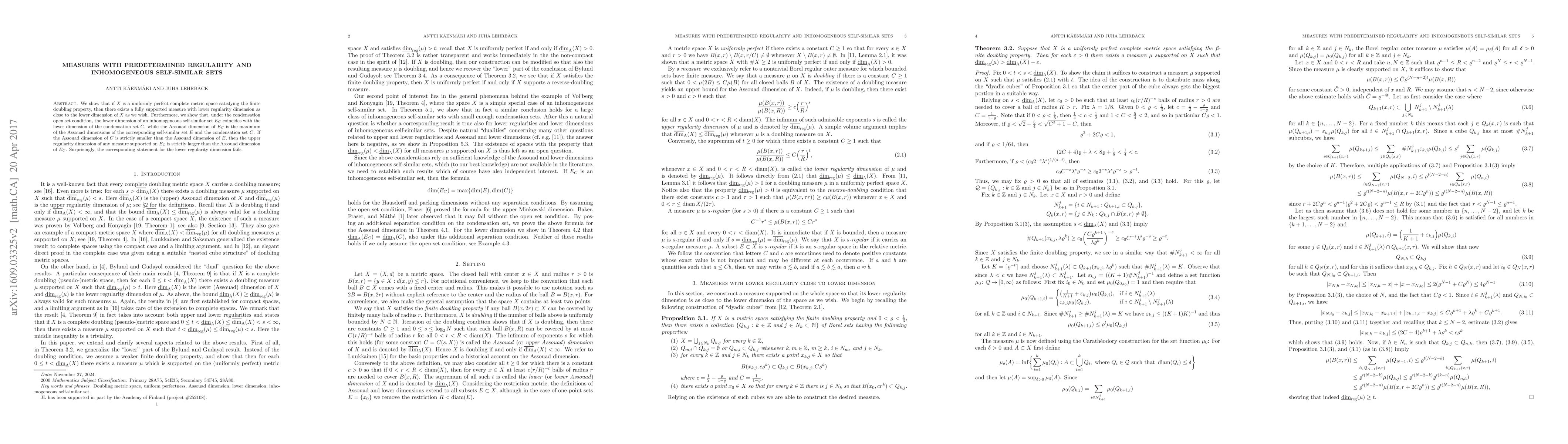 Researchers show that a complete metric space with certain properties can have a measure with lower regularity dimension close to its dimension, and provide conditions for the relationship between dimensions of self-similar sets and condensation sets.