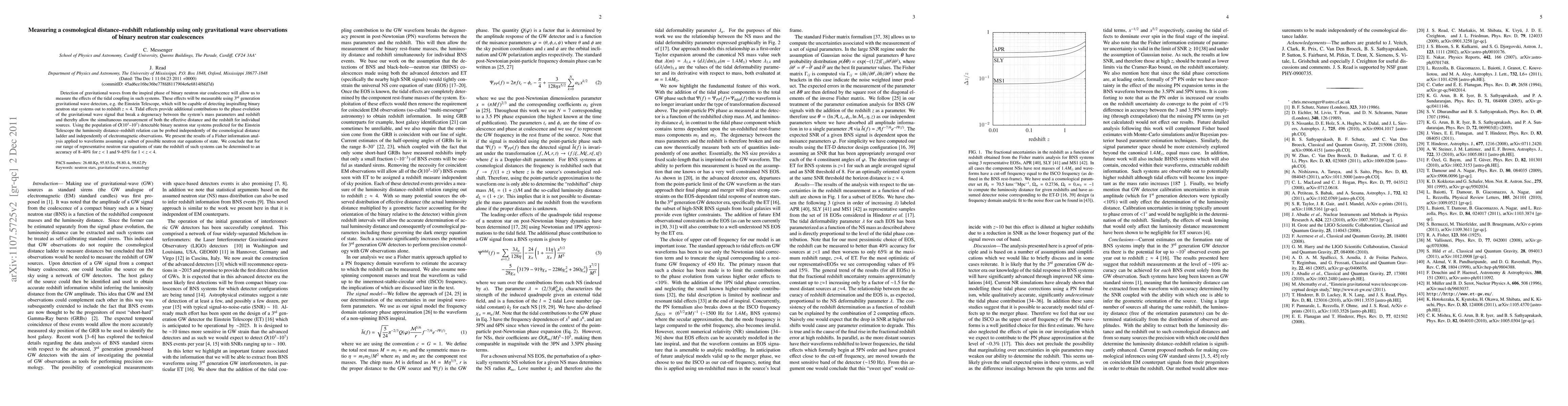 This paper explores using gravitational wave observations from binary neutron star coalescences to measure the cosmological distance-redshift relationship, independent of electromagnetic observations. The study finds that tidal effects in the gravitational wave signal allow for precise redshift measurements, with accuracies of 8-40% for z<1 and 9-65% for 1<z<4, using third-generation detectors like the Einstein Telescope.