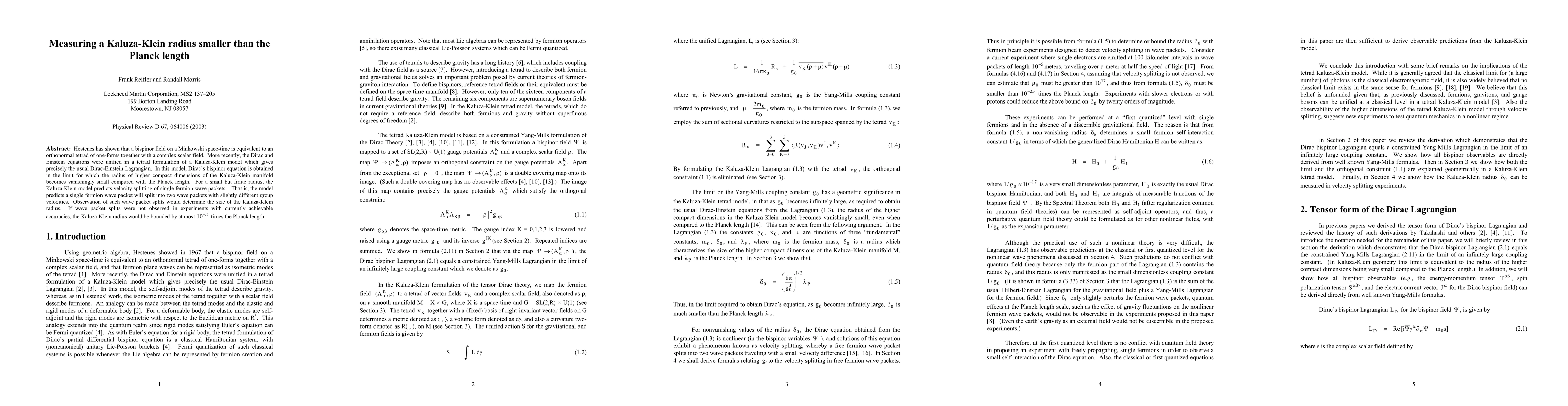 Hestenes has shown that a bispinor field on a Minkowski space-time is equivalent to an orthonormal tetrad of one-forms together with a complex scalar field. More recently, the Dirac and Einstein equations were unified in a tetrad formulation of a Kaluza-Klein model which gives precisely the usual Dirac-Einstein Lagrangian. In this model, Dirac's bispinor equation is obtained in the limit for which the radius of higher compact dimensions of the Kaluza-Klein manifold becomes vanishingly small compared with the Planck length. For a small but finite radius, the Kaluza-Klein model predicts velocity splitting of single fermion wave packets. That is, the model predicts a single fermion wave packet will split into two wave packets with slightly different group velocities. Observation of such wave packet splits would determine the size of the Kaluza-Klein radius. If wave packet splits were not observed in experiments with currently achievable accuracies, the Kaluza-Klein radius would be at least twenty five orders of magnitude smaller than the Planck length.