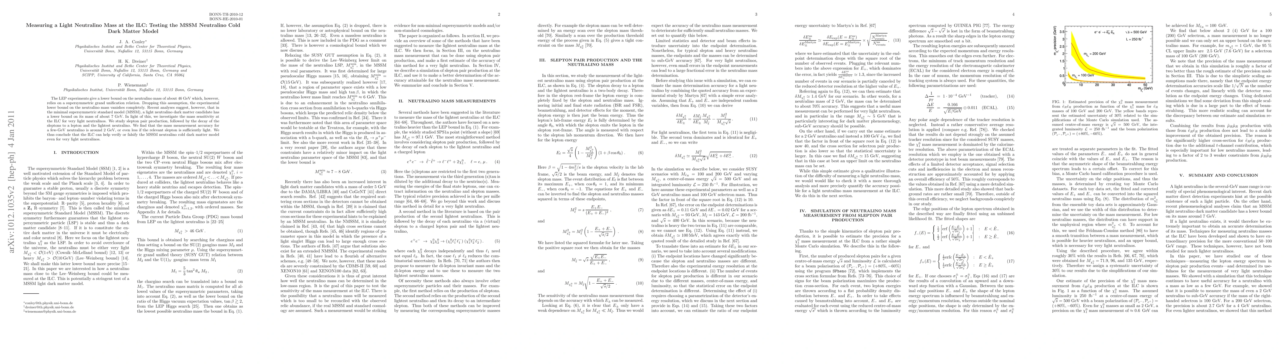 This paper investigates the mass sensitivity of a light neutralino at the International Linear Collider (ILC), focusing on its potential as a dark matter candidate in the minimal supersymmetric standard model (MSSM). The study finds that the ILC can accurately measure neutralino masses down to a few GeV, suggesting it can test the MSSM neutralino cold dark matter model even for very light neutralinos.