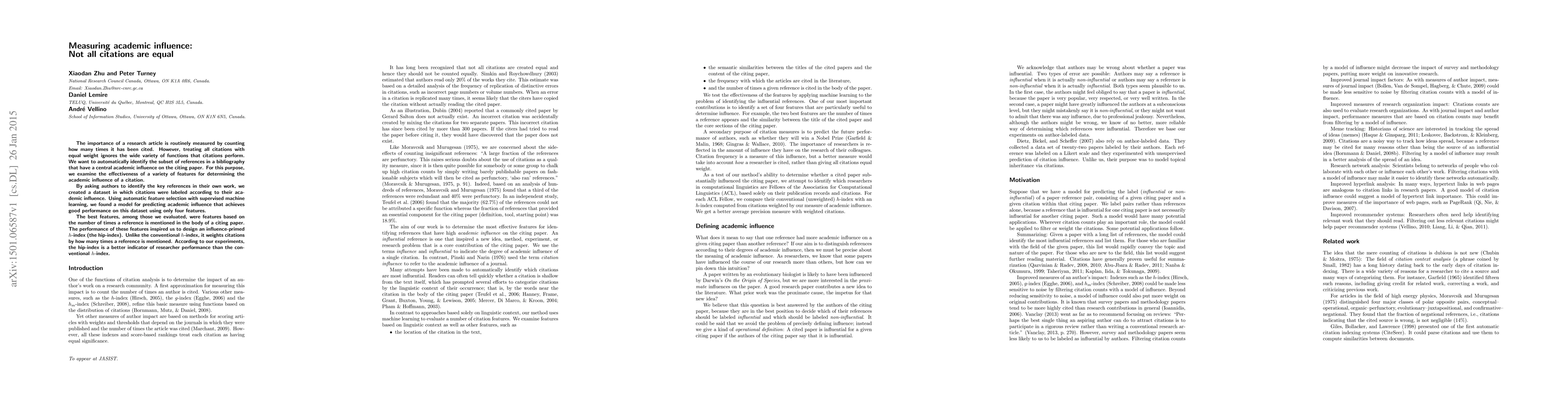The importance of a research article is routinely measured by counting how many times it has been cited. However, treating all citations with equal weight ignores the wide variety of functions that citations perform. We want to automatically identify the subset of references in a bibliography that have a central academic influence on the citing paper. For this purpose, we examine the effectiveness of a variety of features for determining the academic influence of a citation. By asking authors to identify the key references in their own work, we created a data set in which citations were labeled according to their academic influence. Using automatic feature selection with supervised machine learning, we found a model for predicting academic influence that achieves good performance on this data set using only four features. The best features, among those we evaluated, were those based on the number of times a reference is mentioned in the body of a citing paper. The performance of these features inspired us to design an influence-primed h-index (the hip-index). Unlike the conventional h-index, it weights citations by how many times a reference is mentioned. According to our experiments, the hip-index is a better indicator of researcher performance than the conventional h-index.