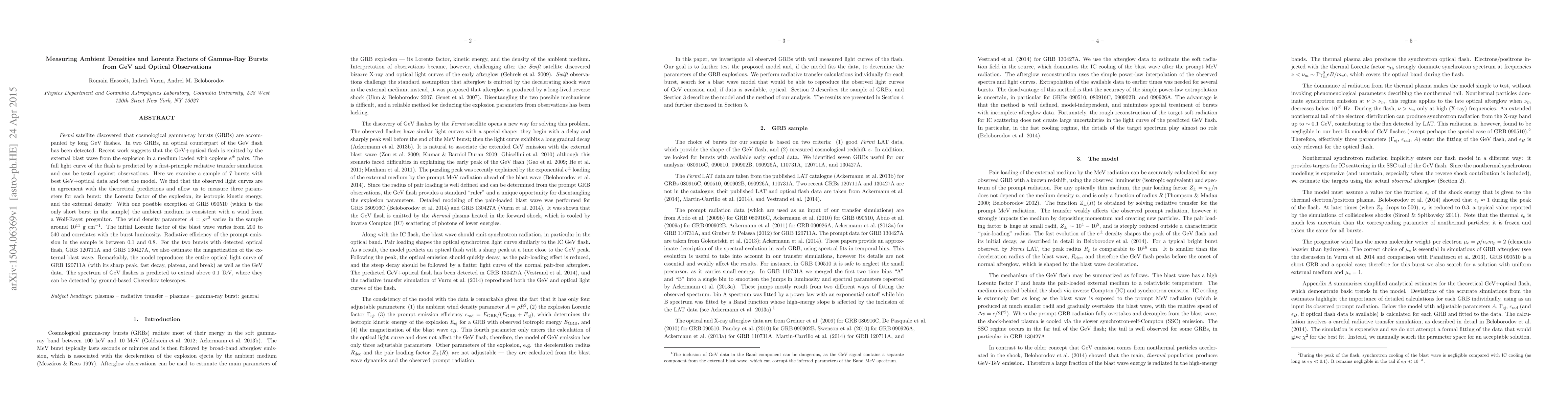 Fermi satellite discovered that cosmological gamma-ray bursts (GRBs) are accompanied by long GeV flashes. In two GRBs, an optical counterpart of the GeV flash has been detected. Recent work suggests that the GeV+optical flash is emitted by the external blast wave from the explosion in a medium loaded with copious $e^\pm$ pairs. The full light curve of the flash is predicted by a first-principle radiative transfer simulation and can be tested against observations. Here we examine a sample of 7 bursts with best GeV+optical data and test the model. We find that the observed light curves are in agreement with the theoretical predictions and allow us to measure three parameters for each burst: the Lorentz factor of the explosion, its isotropic kinetic energy, and the external density. With one possible exception of GRB 090510 (which is the only short burst in the sample) the ambient medium is consistent with a wind from a Wolf-Rayet progenitor. The wind density parameter $A=\rho r^2$ varies in the sample around $10^{11}$g/cm. The initial Lorentz factor of the blast wave varies from 200 to 540 and correlates with the burst luminosity. Radiative efficiency of the prompt emission in the sample is between 0.1 and 0.8. For the two bursts with detected optical flash, GRB 120711A and GRB 130427A, we also estimate the magnetization of the external blast wave. Remarkably, the model reproduces the entire optical light curve of GRB 120711A (with its sharp peak, fast decay, plateau, and break) as well as the GeV data. The spectrum of GeV flashes is predicted to extend above 0.1 TeV, where they can be detected by ground-based Cherenkov telescopes.