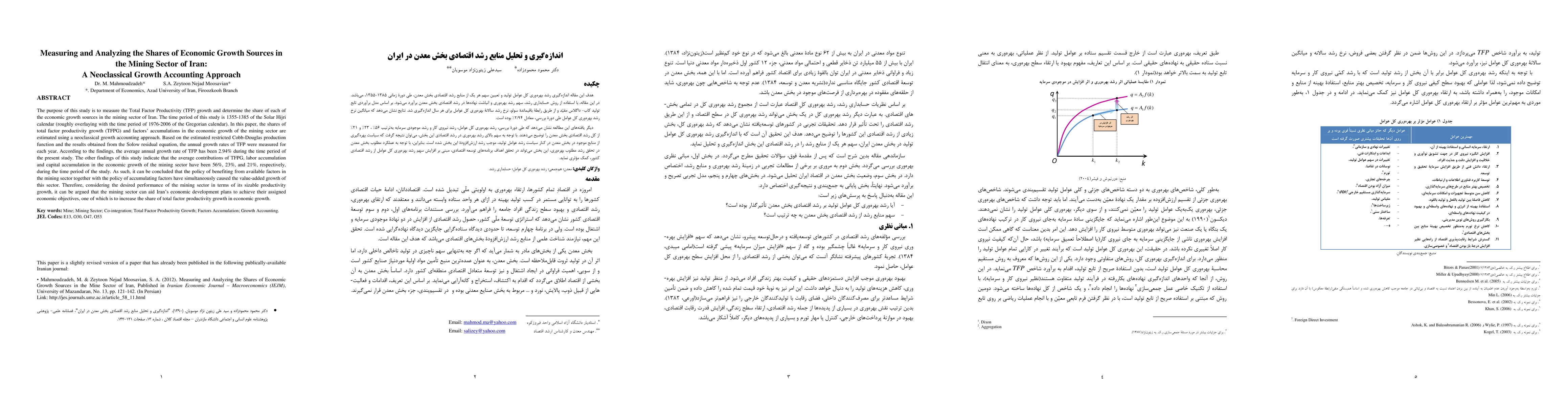 This study measures the Total Factor Productivity (TFP) growth and identifies the contributions of TFP, labor, and capital to economic growth in Iran's mining sector from 1976-2006 using a neoclassical growth accounting approach. The average annual TFP growth rate was 2.94%, with TFP, labor, and capital contributing 56%, 23%, and 21% respectively to the sector's growth.