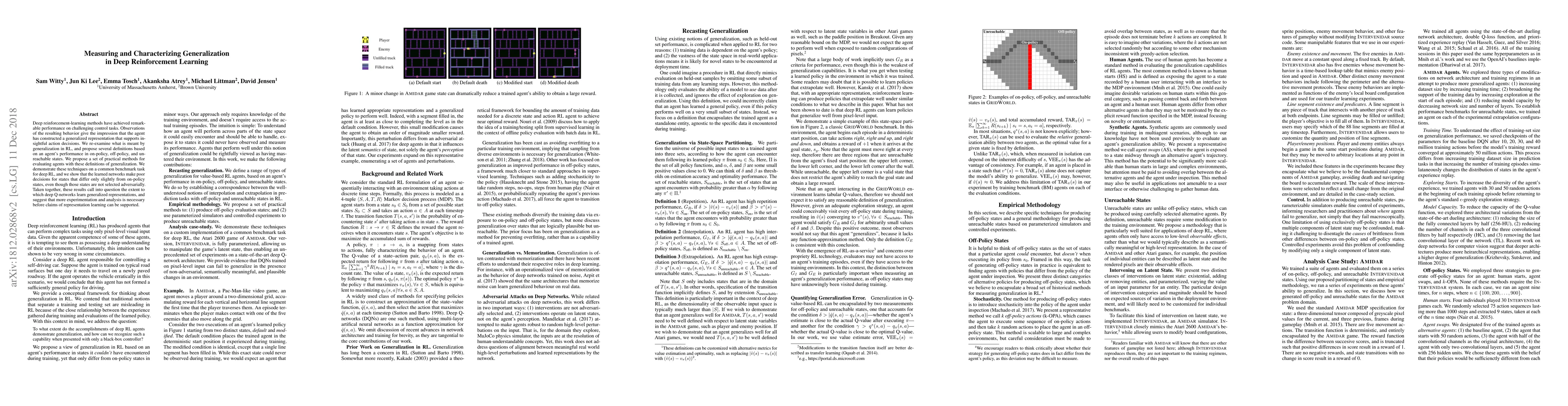Deep reinforcement-learning methods have achieved remarkable performance on challenging control tasks. Observations of the resulting behavior give the impression that the agent has constructed a generalized representation that supports insightful action decisions. We re-examine what is meant by generalization in RL, and propose several definitions based on an agent's performance in on-policy, off-policy, and unreachable states. We propose a set of practical methods for evaluating agents with these definitions of generalization. We demonstrate these techniques on a common benchmark task for deep RL, and we show that the learned networks make poor decisions for states that differ only slightly from on-policy states, even though those states are not selected adversarially. Taken together, these results call into question the extent to which deep Q-networks learn generalized representations, and suggest that more experimentation and analysis is necessary before claims of representation learning can be supported.