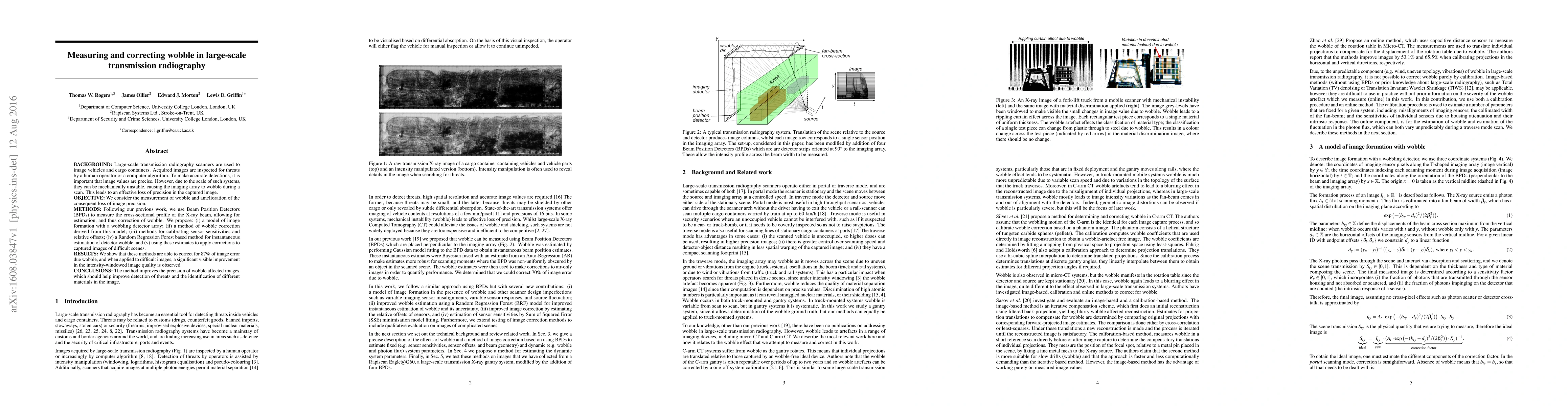 Large-scale transmission radiography scanners are used to image vehicles and cargo containers. Acquired images are inspected for threats by a human operator or a computer algorithm. To make accurate detections, it is important that image values are precise. However, due to the scale of such systems, they can be mechanically unstable, causing the imaging array to wobble during a scan. This leads to an effective loss of precision in the captured image. We consider the measurement of wobble and amelioration of the consequent loss of image precision. Following our previous work, we use Beam Position Detectors (BPDs) to measure the cross-sectional profile of the X-ray beam, allowing for estimation, and thus correction of wobble. We propose: (i) a model of image formation with a wobbling detector array; (ii) a method of wobble correction derived from this model; (iii) methods for calibrating sensor sensitivities and relative offsets; (iv) a Random Regression Forest based method for instantaneous estimation of detector wobble, and (v) using these estimates to apply corrections to captured images of difficult scenes. We show that these methods are able to correct for $87\%$ of image error due wobble, and when applied to difficult images, a significant visible improvement in the intensity-windowed image quality is observed. The method improves the precision of wobble affected images, which should help improve detection of threats and the identification of different materials in the image.