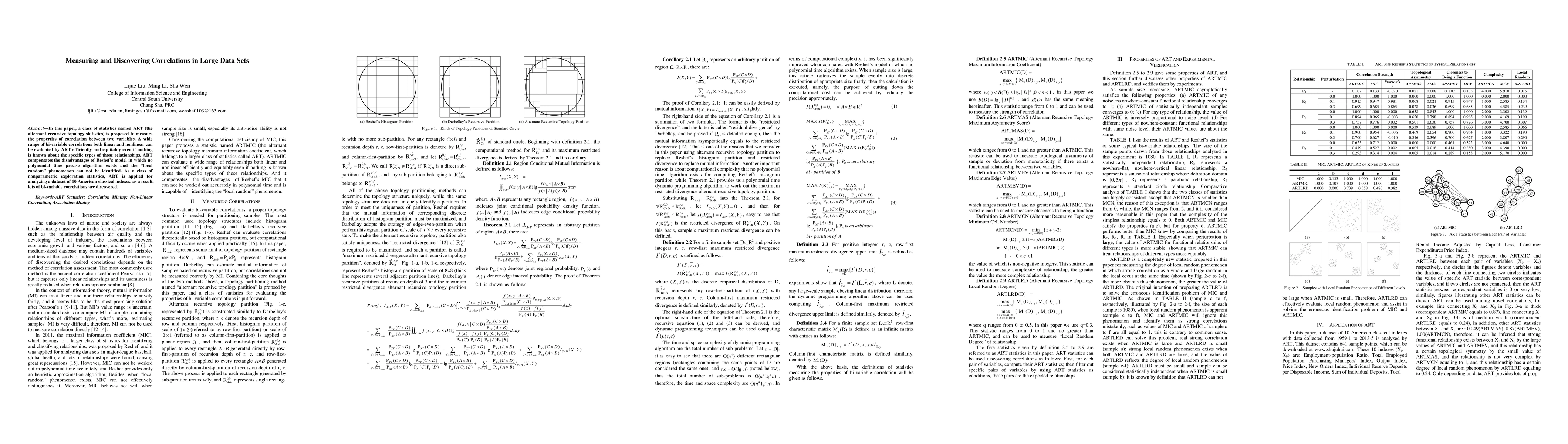 In this paper, a class of statistics named ART (the alternant recursive topology statistics) is proposed to measure the properties of correlation between two variables. A wide range of bi-variable correlations both linear and nonlinear can be evaluated by ART efficiently and equitably even if nothing is known about the specific types of those relationships. ART compensates the disadvantages of Reshef's model in which no polynomial time precise algorithm exists and the "local random" phenomenon can not be identified. As a class of nonparametric exploration statistics, ART is applied for analyzing a dataset of 10 American classical indexes, as a result, lots of bi-variable correlations are discovered.