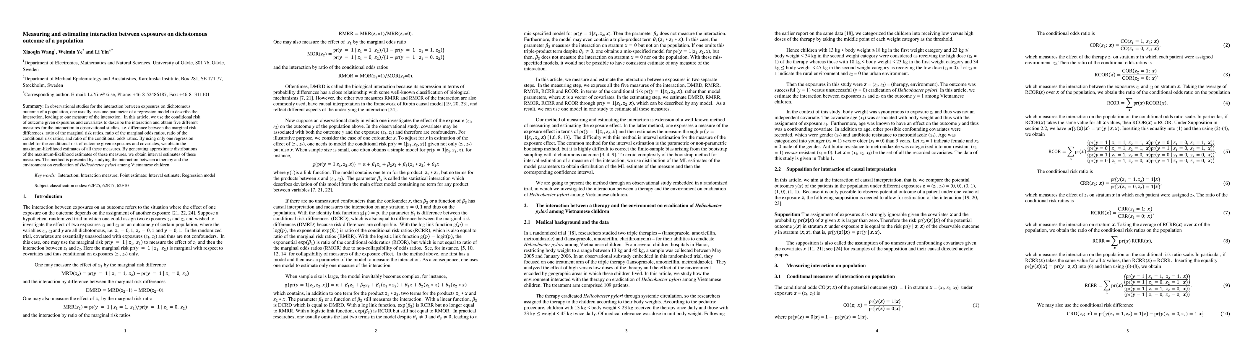This paper proposes five measures to assess interaction between exposures on a dichotomous outcome in observational studies, using conditional risk and maximum-likelihood estimates. The method is demonstrated through the interaction between therapy and environment on eradicating Helicobacter pylori in Vietnamese children.