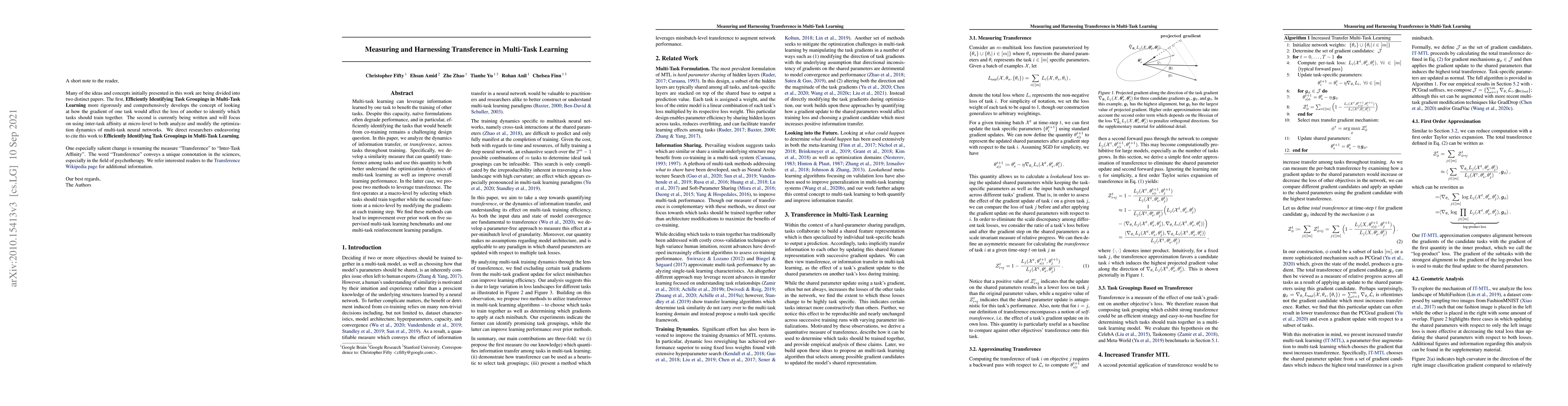 Multi-task learning can leverage information learned by one task to benefit the training of other tasks. Despite this capacity, naive formulations often degrade performance and in particular, identifying the tasks that would benefit from co-training remains a challenging design question. In this paper, we analyze the dynamics of information transfer, or transference, across tasks throughout training. Specifically, we develop a similarity measure that can quantify transference among tasks and use this quantity to both better understand the optimization dynamics of multi-task learning as well as improve overall learning performance. In the latter case, we propose two methods to leverage our transference metric. The first operates at a macro-level by selecting which tasks should train together while the second functions at a micro-level by determining how to combine task gradients at each training step. We find these methods can lead to significant improvement over prior work on three supervised multi-task learning benchmarks and one multi-task reinforcement learning paradigm.
