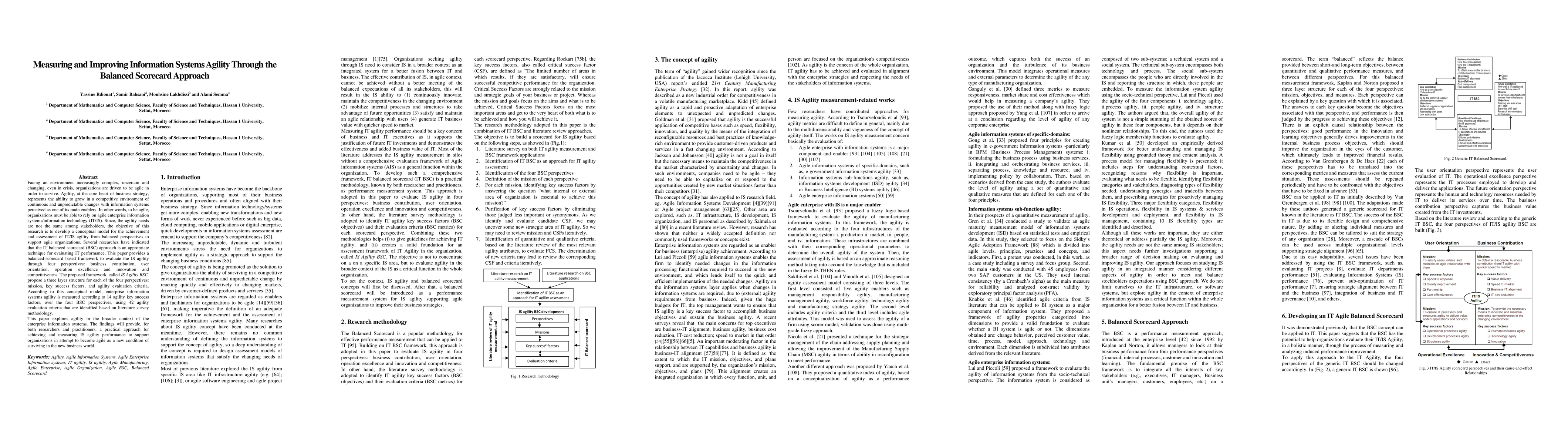 This paper develops a balanced scorecard-based framework, IS Agility BSC, to evaluate information systems (IS) agility through four perspectives: business contribution, user orientation, operation excellence, and innovation and competitiveness. The framework uses 14 key success factors and 42 evaluation criteria to measure IS agility, providing a practical approach for organizations to achieve and assess agility in their enterprise information systems.