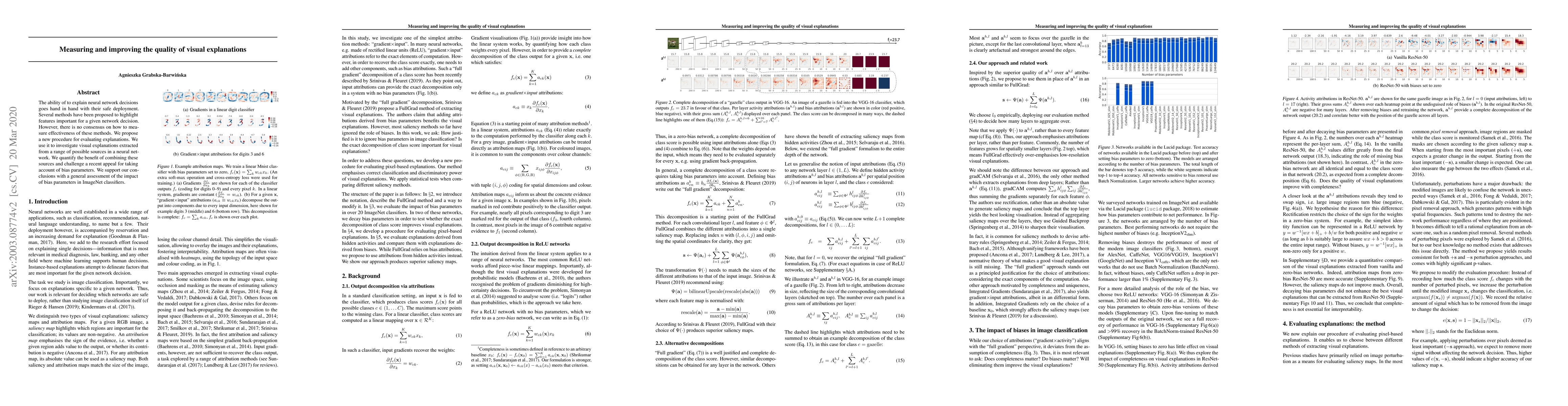 The ability of to explain neural network decisions goes hand in hand with their safe deployment. Several methods have been proposed to highlight features important for a given network decision. However, there is no consensus on how to measure effectiveness of these methods. We propose a new procedure for evaluating explanations. We use it to investigate visual explanations extracted from a range of possible sources in a neural network. We quantify the benefit of combining these sources and challenge a recent appeal for taking bias parameters into account. We support our conclusions with a general assessment of the impact of bias parameters in ImageNet classifiers