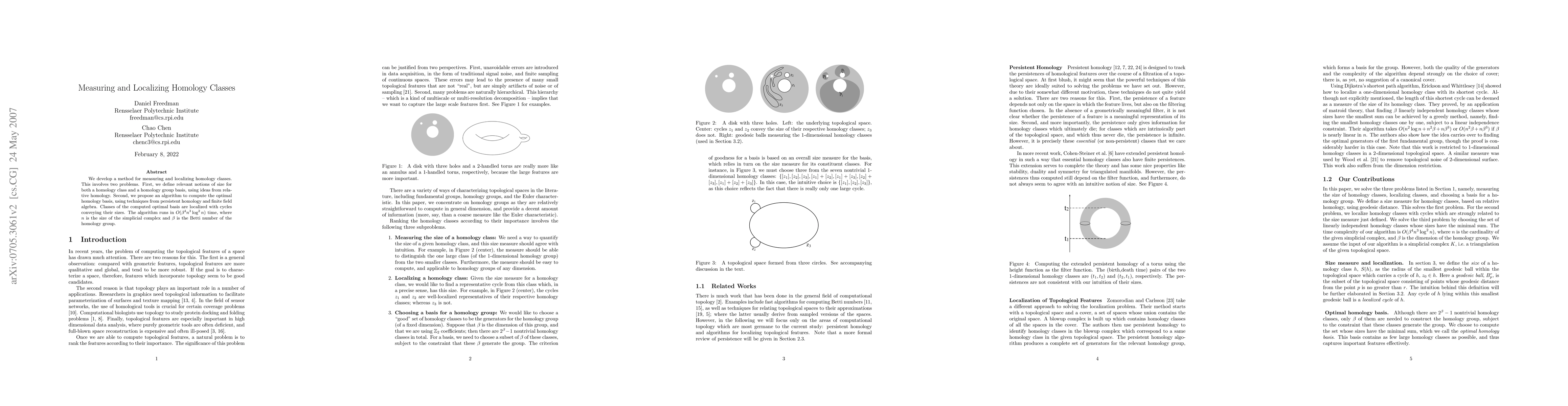 We develop a method for measuring and localizing homology classes. This involves two problems. First, we define relevant notions of size for both a homology class and a homology group basis, using ideas from relative homology. Second, we propose an algorithm to compute the optimal homology basis, using techniques from persistent homology and finite field algebra. Classes of the computed optimal basis are localized with cycles conveying their sizes. The algorithm runs in $O(\beta^4 n^3 \log^2 n)$ time, where $n$ is the size of the simplicial complex and $\beta$ is the Betti number of the homology group.
