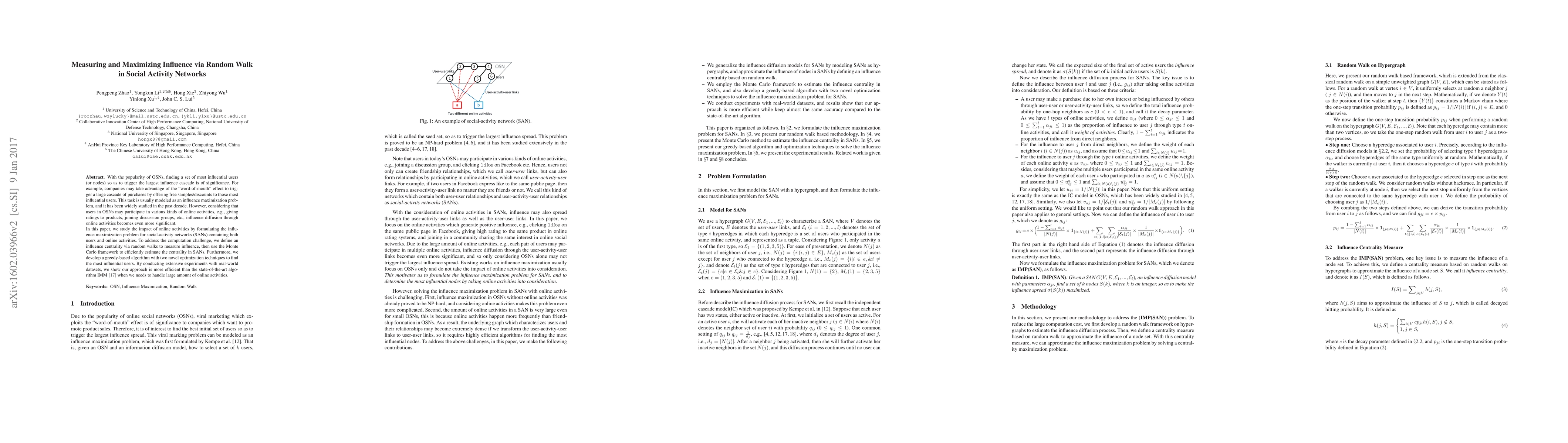 With the popularity of OSNs, finding a set of most influential users (or nodes) so as to trigger the largest influence cascade is of significance. For example, companies may take advantage of the "word-of-mouth" effect to trigger a large cascade of purchases by offering free samples/discounts to those most influential users. This task is usually modeled as an influence maximization problem, and it has been widely studied in the past decade. However, considering that users in OSNs may participate in various kinds of online activities, e.g., giving ratings to products, joining discussion groups, etc., influence diffusion through online activities becomes even more significant. In this paper, we study the impact of online activities by formulating the influence maximization problem for social-activity networks (SANs) containing both users and online activities. To address the computation challenge, we define an influence centrality via random walks to measure influence, then use the Monte Carlo framework to efficiently estimate the centrality in SANs. Furthermore, we develop a greedy-based algorithm with two novel optimization techniques to find the most influential users. By conducting extensive experiments with real-world datasets, we show our approach is more efficient than the state-of-the-art algorithm IMM[17] when we needs to handle large amount of online activities.