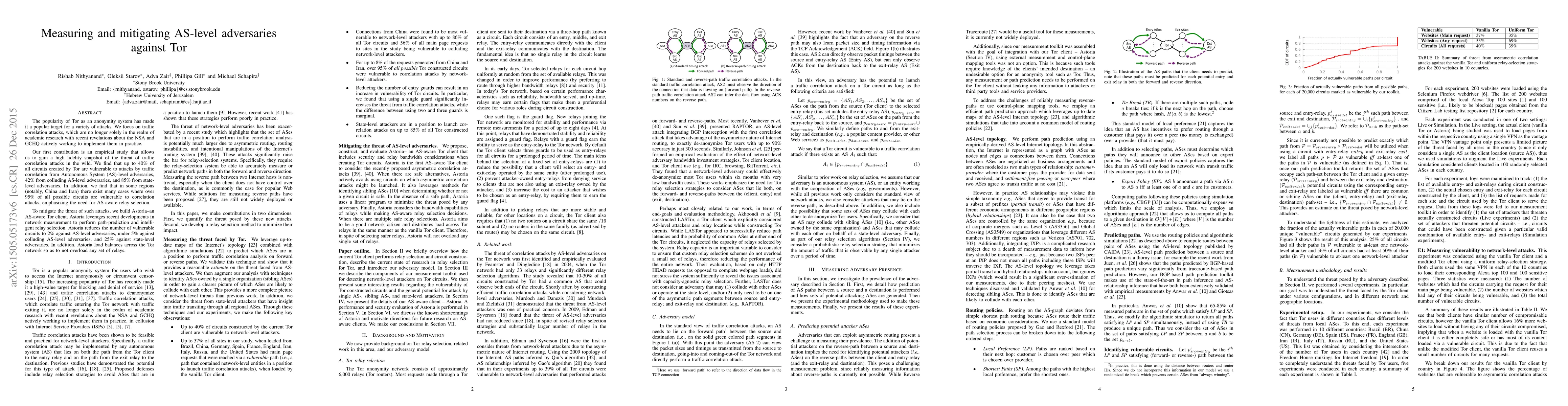 This paper presents an empirical study on the threat of traffic correlation attacks against Tor, revealing that up to 40% of Tor circuits are vulnerable to AS-level adversaries. To mitigate these threats, the authors introduce Astoria, an AS-aware Tor client that reduces vulnerability to 2% against AS-level adversaries and implements intelligent relay selection to balance network load.