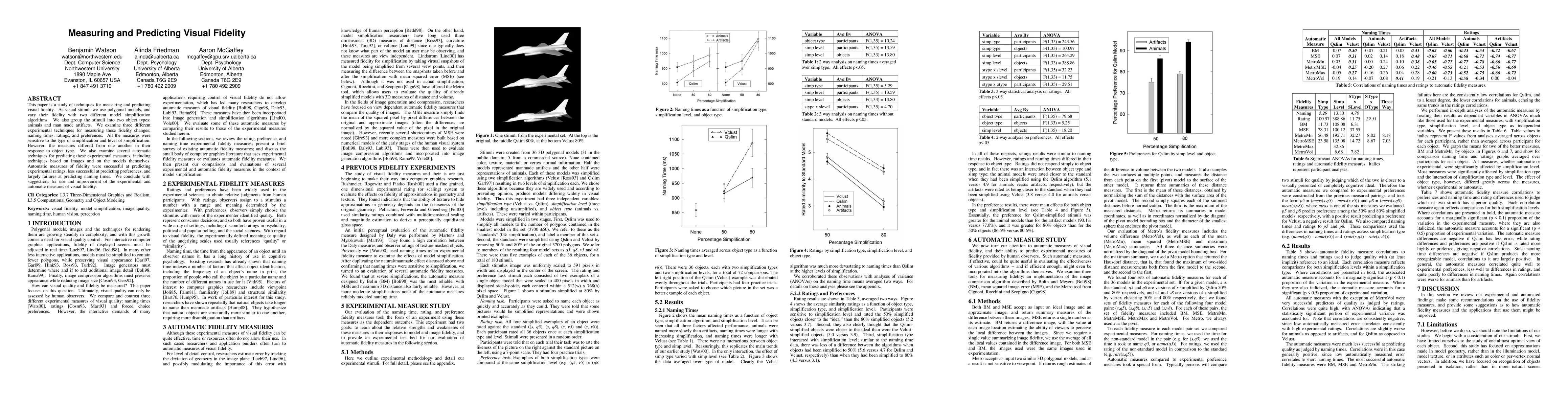 This paper is a study of techniques for measuring and predicting visual fidelity. As visual stimuli we use polygonal models, and vary their fidelity with two different model simplification algorithms. We also group the stimuli into two object types: animals and man made artifacts. We examine three different experimental techniques for measuring these fidelity changes: naming times, ratings, and preferences. All the measures were sensitive to the type of simplification and level of simplification. However, the measures differed from one another in their response to object type. We also examine several automatic techniques for predicting these experimental measures, including techniques based on images and on the models themselves. Automatic measures of fidelity were successful at predicting experimental ratings, less successful at predicting preferences, and largely failures at predicting naming times. We conclude with suggestions for use and improvement of the experimental and automatic measures of visual fidelity.