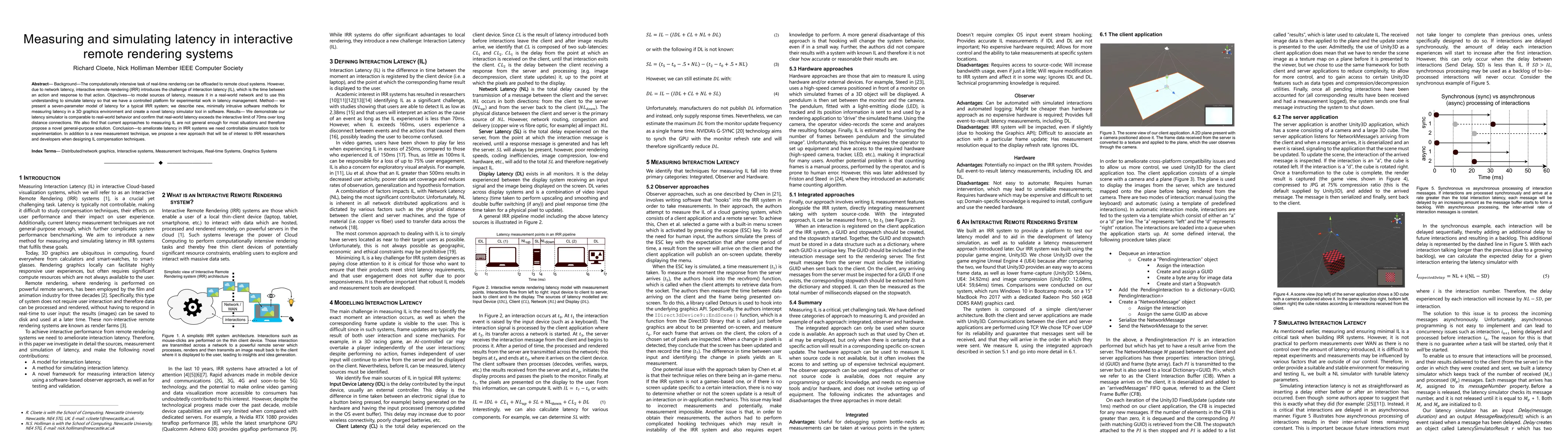 Researchers developed a seven-parameter model of latency for interactive remote rendering systems and created a simulator tool to study interaction latency, finding that real-world latency often exceeds the 70ms interactive limit over long distance connections.