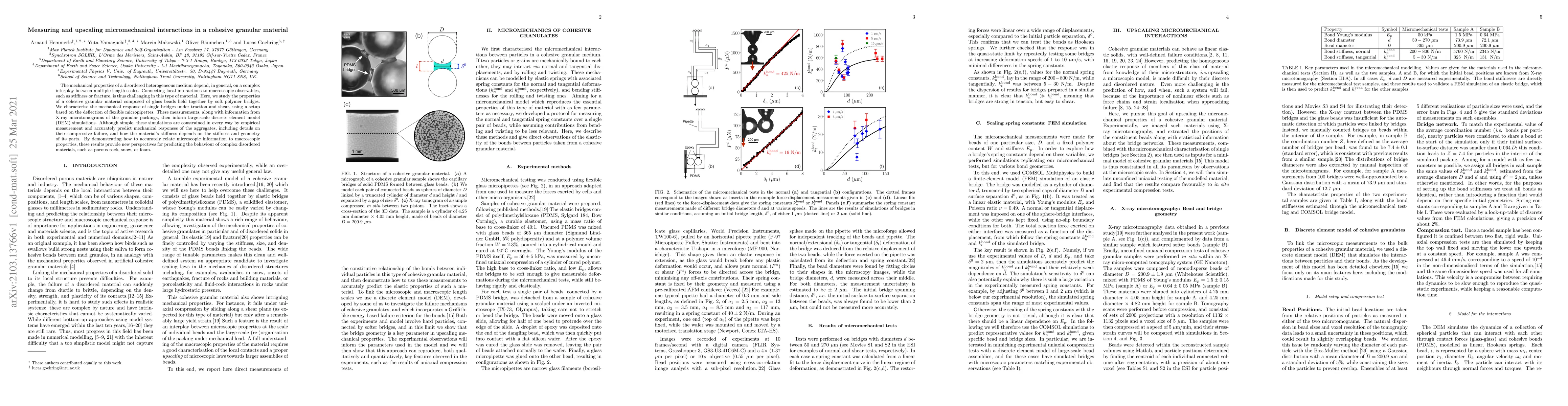 This paper investigates the mechanical properties of cohesive granular materials using glass beads connected by polymer bridges, employing micropipette deflection and X-ray microtomograms to characterize local interactions. Large-scale discrete element model simulations, informed by empirical measurements, accurately predict macroscopic mechanical responses, offering new insights for understanding disordered materials like porous rock and snow.