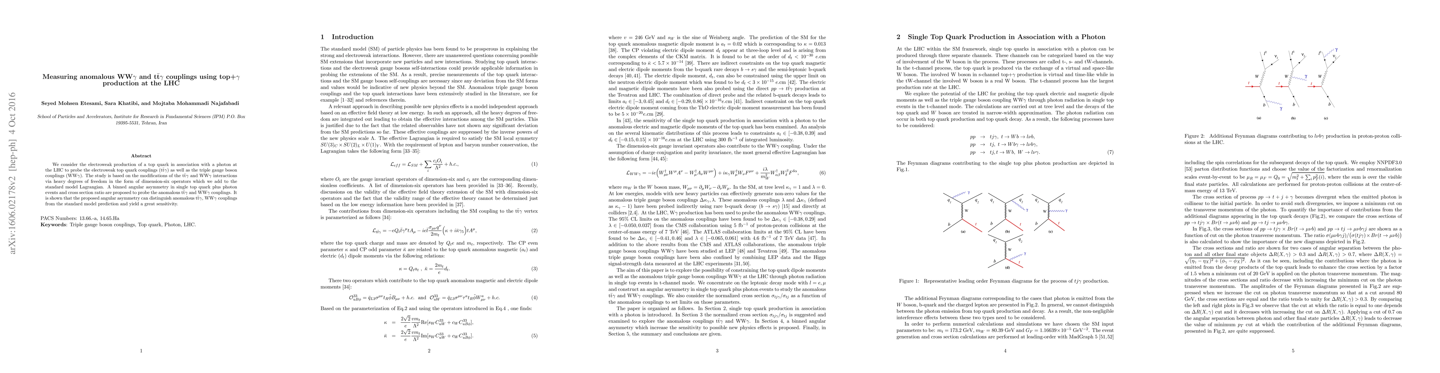 This paper investigates the electroweak production of a top quark with a photon at the LHC to probe anomalous t$\bar{\text{t}}\gamma$ and WW$\gamma$ couplings. It proposes a binned angular asymmetry and cross section ratio to detect deviations from the standard model, demonstrating high sensitivity to these anomalous couplings.