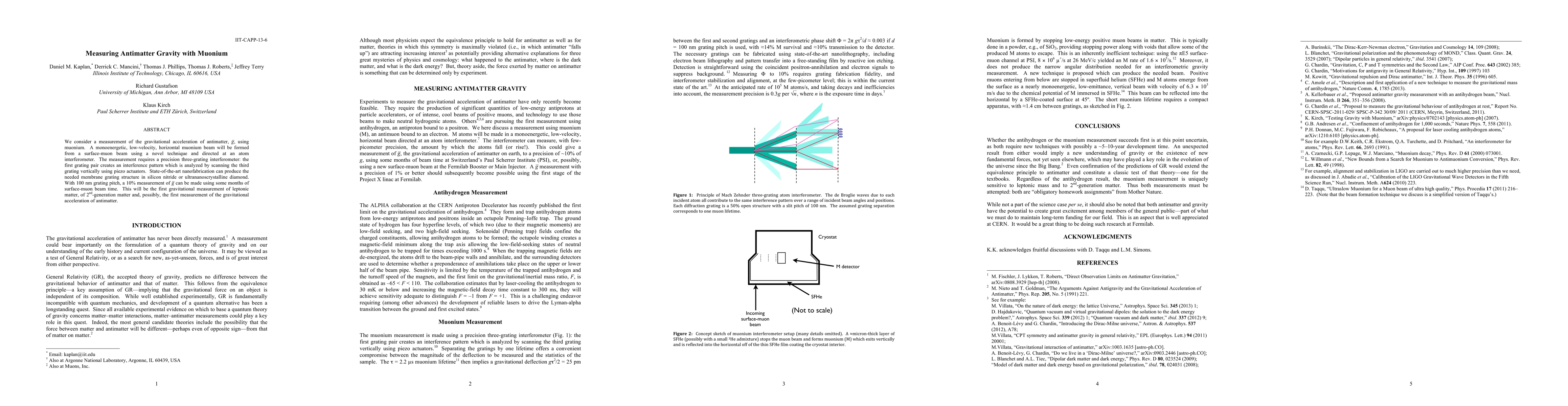 This research aims to measure the gravitational acceleration of antimatter, gbar, using muonium and an atom interferometer. A novel technique will produce a low-velocity muonium beam, which will be analyzed with a precision three-grating interferometer, potentially achieving a 10% measurement of gbar within a few months.