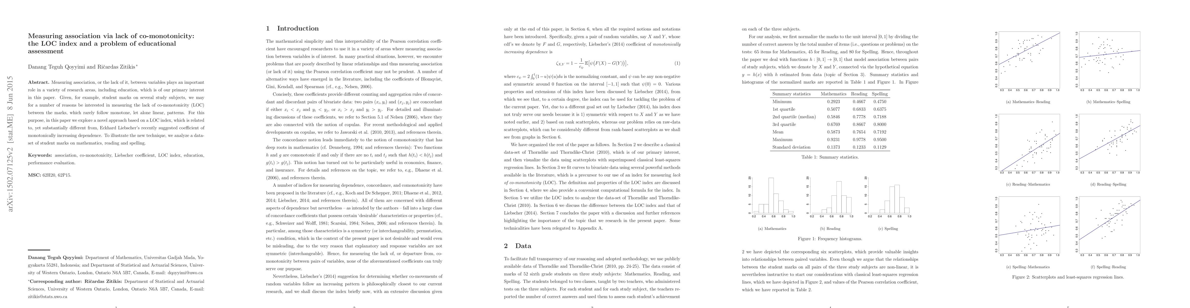 Measuring association, or the lack of it, between variables plays an important role in a variety of research areas, including education, which is of our primary interest in this paper. Given, for example, student marks on several study subjects, we may for a number of reasons be interested in measuring the lack of co-monotonicity (LOC) between the marks, which rarely follow monotone, let alone linear, patterns. For this purpose, in this paper we explore a novel approach based on a LOC index, which is related to, yet substantially different from, Eckhard Liebscher's recently suggested coefficient of monotonically increasing dependence. To illustrate the new technique, we analyze a data-set of student marks on mathematics, reading and spelling.