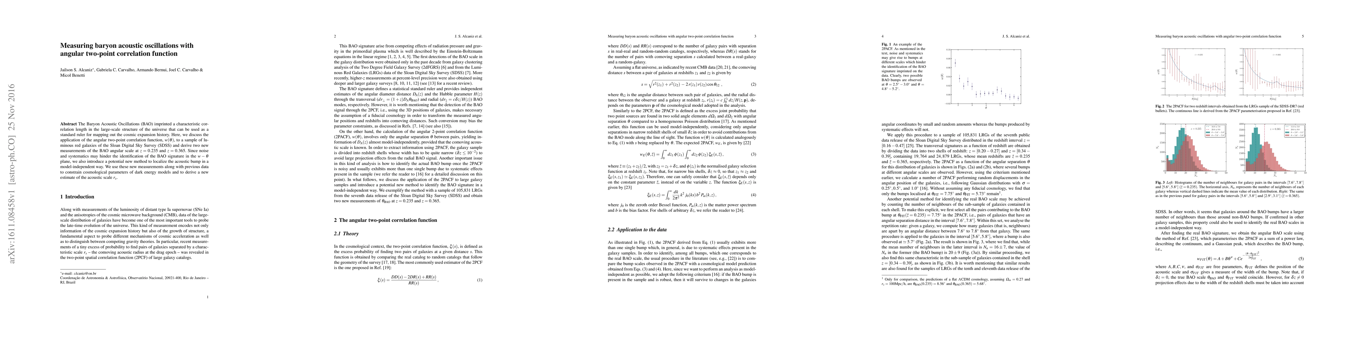 This paper measures Baryon Acoustic Oscillations (BAO) using the angular two-point correlation function $w(\theta)$ from SDSS luminous red galaxies, deriving new BAO scales at $z = 0.235$ and $z = 0.365$. It also proposes a new method to identify the BAO signature independently of models, and uses these measurements to constrain dark energy models and refine the estimate of the acoustic scale $r_s$.