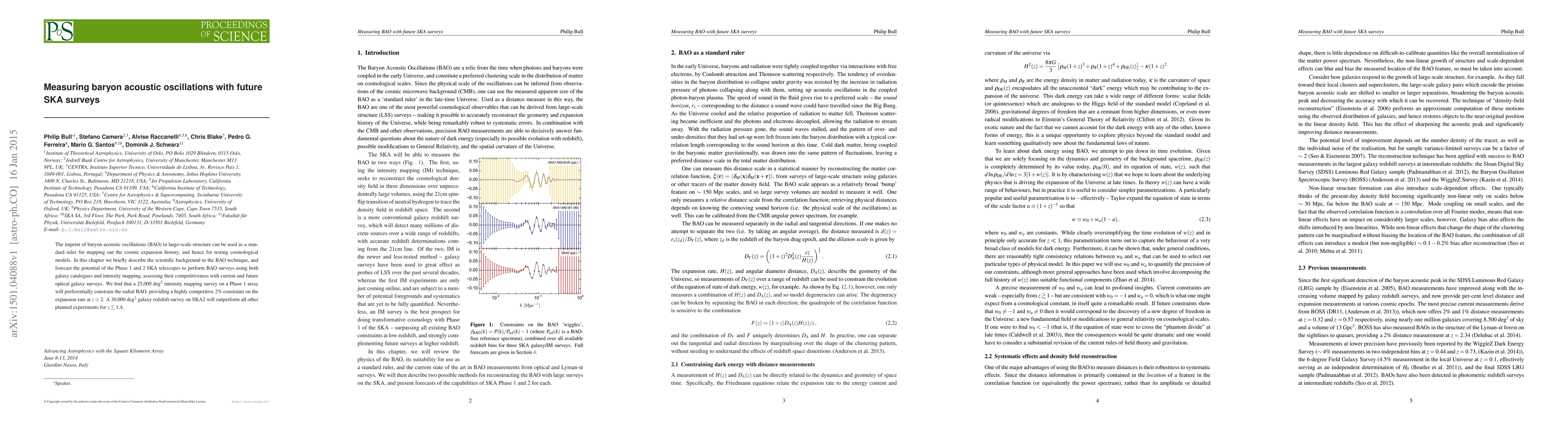 The imprint of baryon acoustic oscillations (BAO) in large-scale structure can be used as a standard ruler for mapping out the cosmic expansion history, and hence for testing cosmological models. In this article we briefly describe the scientific background to the BAO technique, and forecast the potential of the Phase 1 and 2 SKA telescopes to perform BAO surveys using both galaxy catalogues and intensity mapping, assessing their competitiveness with current and future optical galaxy surveys. We find that a 25,000 sq. deg. intensity mapping survey on a Phase 1 array will preferentially constrain the radial BAO, providing a highly competitive 2% constraint on the expansion rate at z ~ 2. A 30,000 sq. deg. galaxy redshift survey on SKA2 will outperform all other planned experiments for z < 1.4.