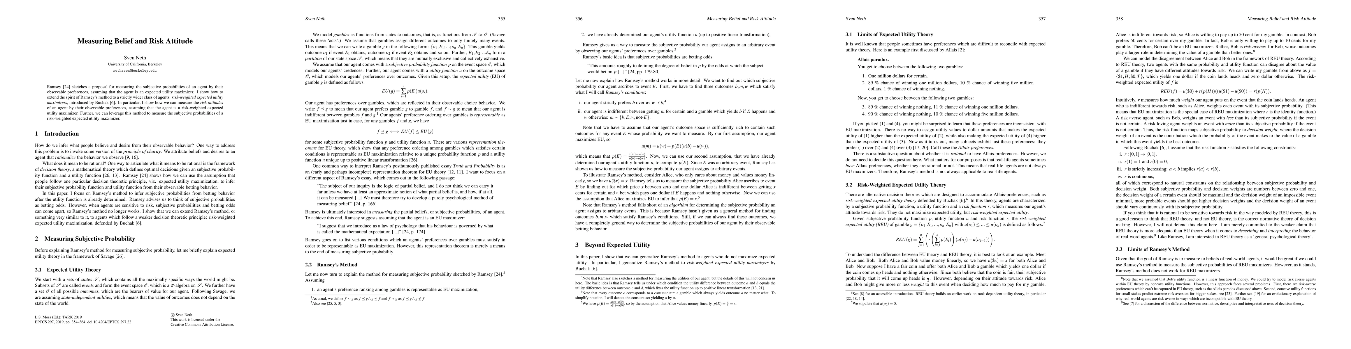 Ramsey (1926) sketches a proposal for measuring the subjective probabilities of an agent by their observable preferences, assuming that the agent is an expected utility maximizer. I show how to extend the spirit of Ramsey's method to a strictly wider class of agents: risk-weighted expected utility maximizers (Buchak 2013). In particular, I show how we can measure the risk attitudes of an agent by their observable preferences, assuming that the agent is a risk-weighted expected utility maximizer. Further, we can leverage this method to measure the subjective probabilities of a risk-weighted expected utility maximizer.