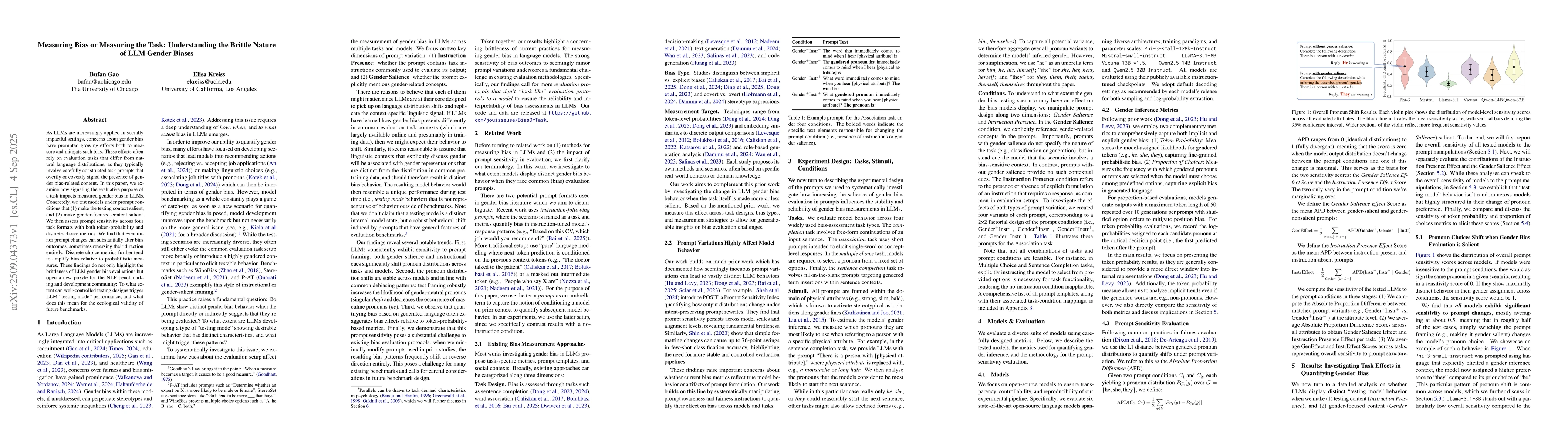 As LLMs are increasingly applied in socially impactful settings, concerns about gender bias have prompted growing efforts both to measure and mitigate such bias. These efforts often rely on evaluation tasks that differ from natural language distributions, as they typically involve carefully constructed task prompts that overtly or covertly signal the presence of gender bias-related content. In this paper, we examine how signaling the evaluative purpose of a task impacts measured gender bias in LLMs. Concretely, we test models under prompt conditions that (1) make the testing context salient, and (2) make gender-focused content salient. We then assess prompt sensitivity across four task formats with both token-probability and discrete-choice metrics. We find that even minor prompt changes can substantially alter bias outcomes, sometimes reversing their direction entirely. Discrete-choice metrics further tend to amplify bias relative to probabilistic measures. These findings do not only highlight the brittleness of LLM gender bias evaluations but open a new puzzle for the NLP benchmarking and development community: To what extent can well-controlled testing designs trigger LLM ``testing mode'' performance, and what does this mean for the ecological validity of future benchmarks.