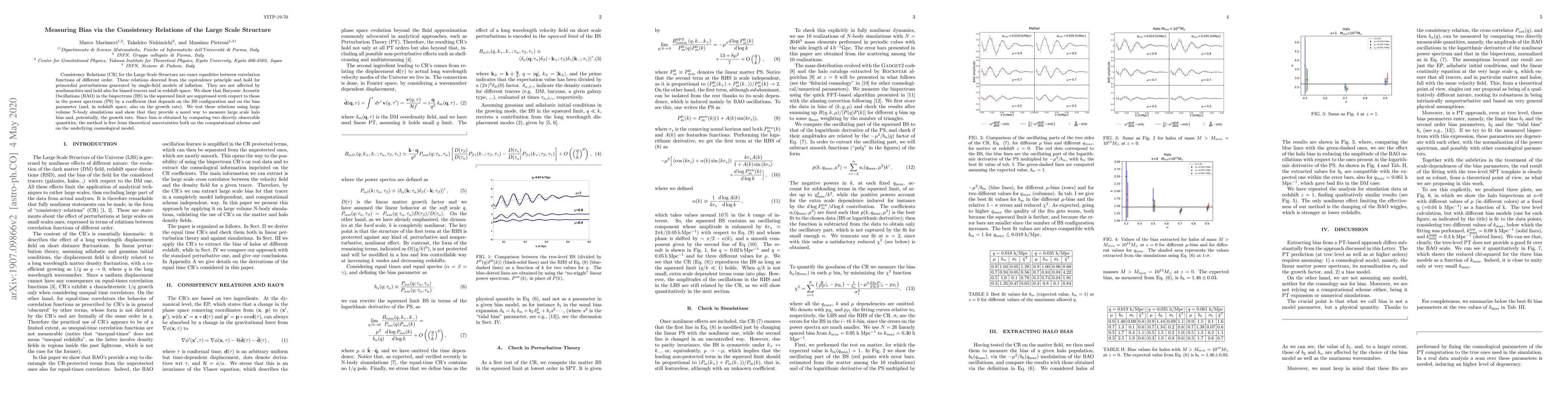 Consistency Relations (CR) for the Large Scale Structure are exact equalities between correlation functions of different order. These relations descend from the equivalence principle and hold for primordial perturbations generated by single-field models of inflation. They are not affected by nonlinearities and hold also for biased tracers and in redshift space. We show that Baryonic Acoustic Oscillations (BAO) in the bispectrum (BS) in the squeezed limit are suppressed with respect to those in the power spectrum (PS) by a coefficient that depends on the BS configuration and on the bias parameter (and, in redshift space, also on the growth rate). We test these relations using large volume N-body simulations and show that they provide a novel way to measure large scale halo bias and, potentially, the growth rate. Since bias is obtained by comparing two directly observable quantities, the method is free from theoretical uncertainties both on the computational scheme and on the underlying cosmological model.