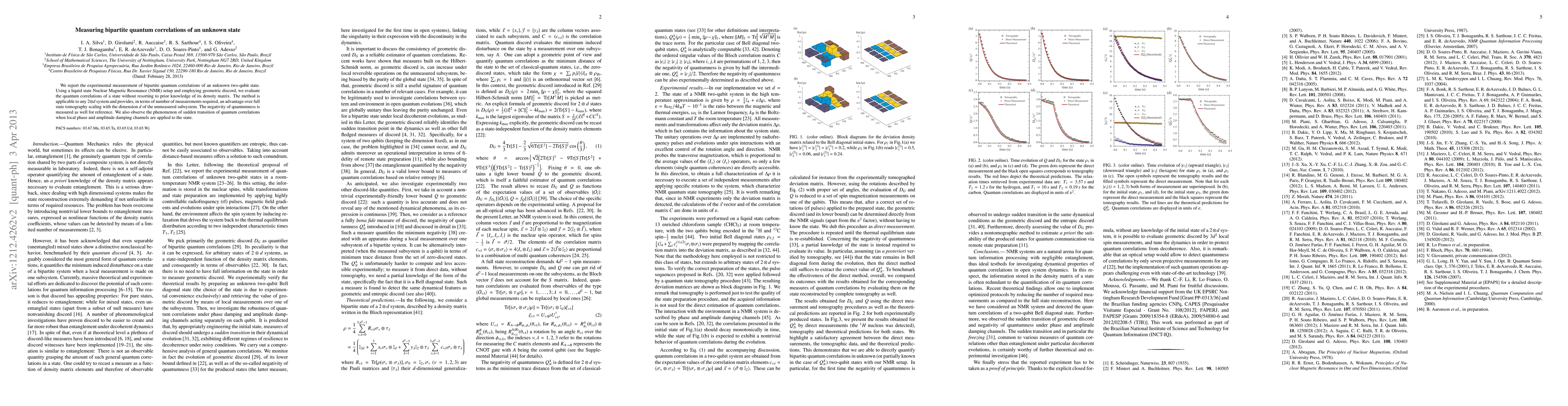 This paper reports an experimental measurement of bipartite quantum correlations using a liquid state NMR setup, evaluating geometric discord in an unknown two-qubit state without prior knowledge of its density matrix. The method scales favorably in terms of measurement requirements compared to full state tomography.
