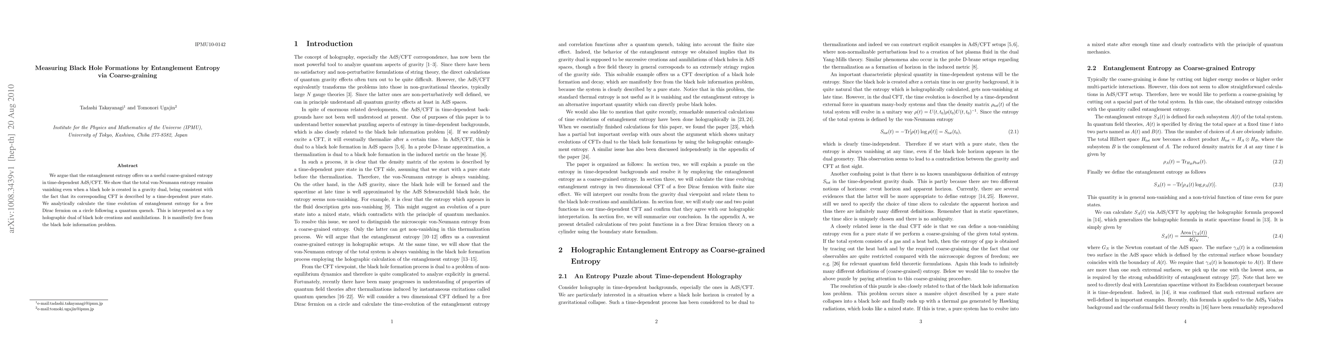 Researchers found that entanglement entropy remains zero when a black hole forms in a gravity dual, avoiding the black hole information problem. They calculated the time evolution of entanglement entropy for a free Dirac fermion on a circle, showing it's consistent with black hole creations and annihilations.